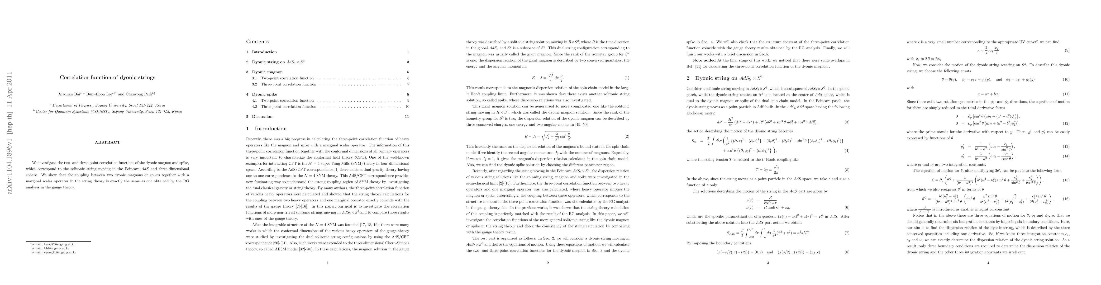 We investigate the two- and three-point correlation functions of the dyonic magnon and spike, which correspond to the solitonic string moving in the Poincare AdS and three-dimensional sphere. We show that the coupling between two dyonic magnons or spikes together with a marginal scalar operator in the string theory is exactly the same as one obtained by the RG analysis in the gauge theory.