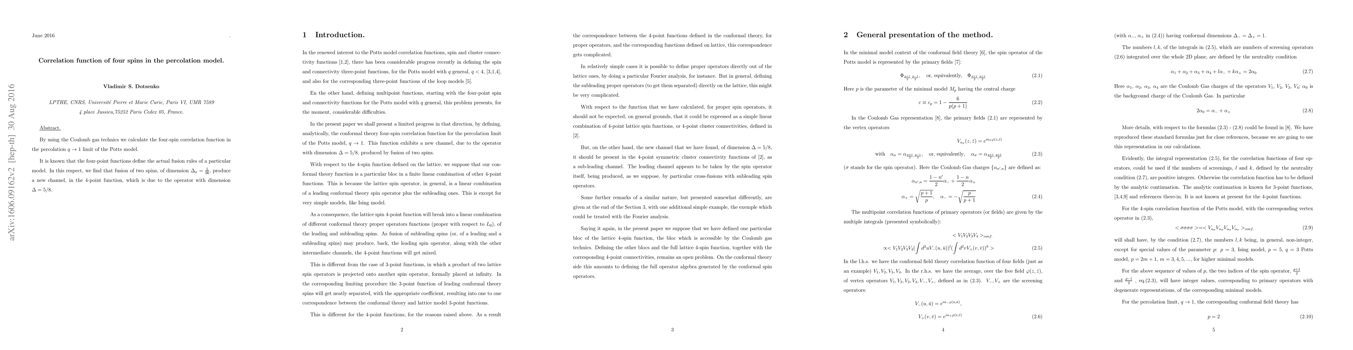 By using the Coulomb gas technics we calculate the four-spin correlation function in the percolation $q\rightarrow 1$ limit of the Potts model. It is known that the four-point functions define the actual fusion rules of a particular model. In this respect, we find that fusion of two spins, of dimension $\Delta_{\sigma}=\frac{5}{96}$, produce a new channel, in the 4-point function, which is due to the operator with dimension $\Delta=5/8$.