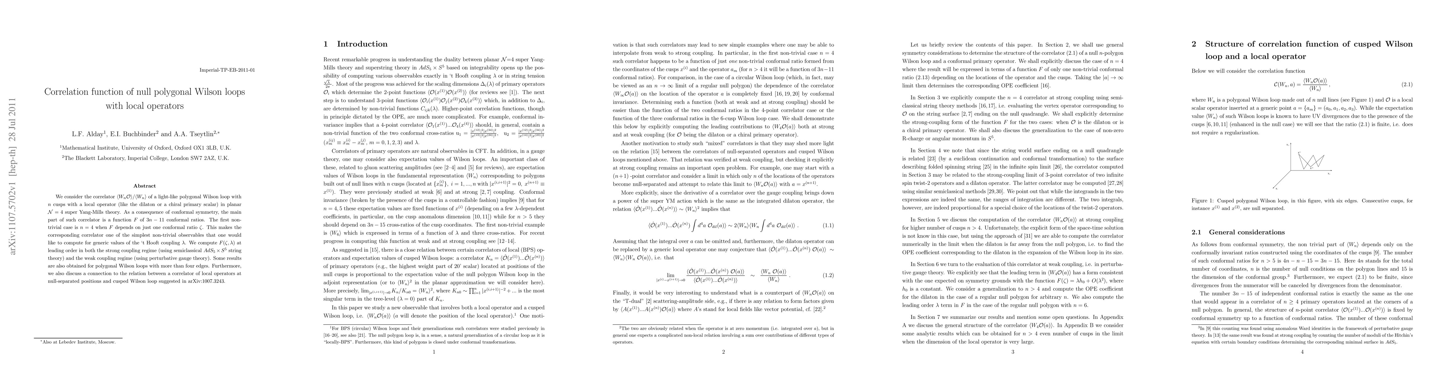 This paper computes the correlation function <W_n O(x)> between a light-like polygonal Wilson loop with n cusps and a local operator in N=4 super Yang-Mills theory, focusing on the simplest case of n=4. It derives F(\zeta,\lambda) at leading order in both strong and weak coupling regimes, and discusses its implications for understanding the relation between local operator correlators and cusped Wilson loops.