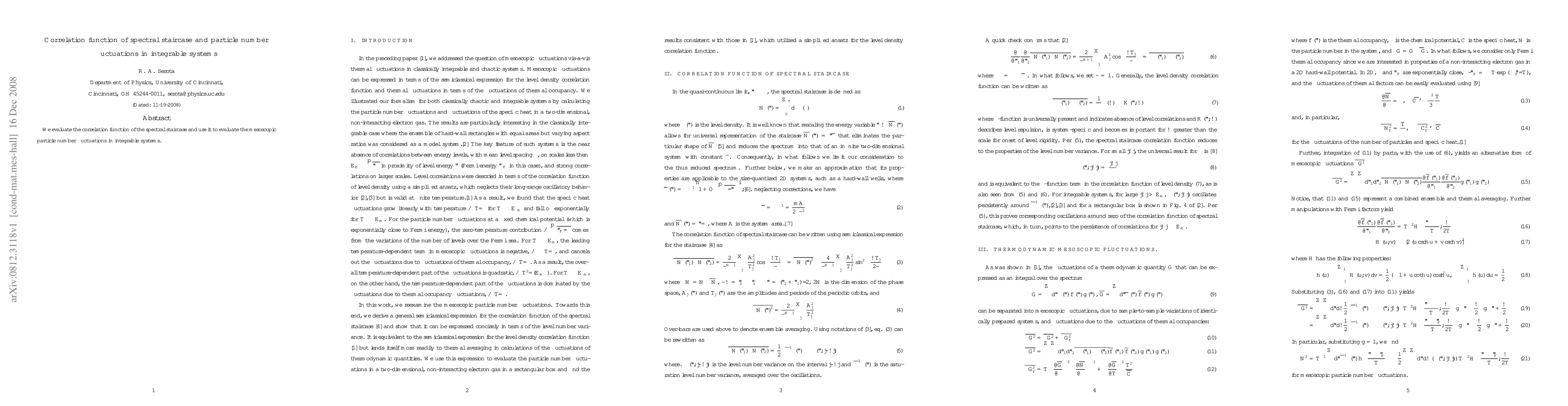 We evaluate the correlation function of the spectral staircase and use it to evaluate the mesoscopic particle number fluctuations in integrable systems.