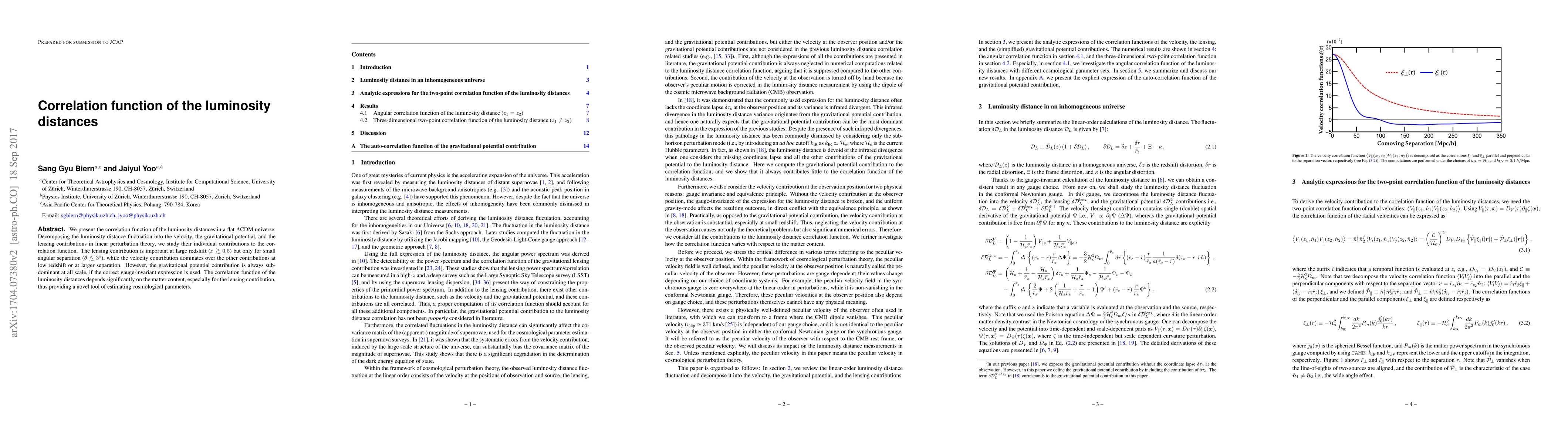 This paper investigates the correlation function of luminosity distances in a flat $\Lambda$CDM universe, finding that the lensing contribution is significant at large redshifts and small angular separations, while velocity effects dominate at low redshifts and larger separations. The gravitational potential's contribution is consistently minor, offering a new method for estimating cosmological parameters.