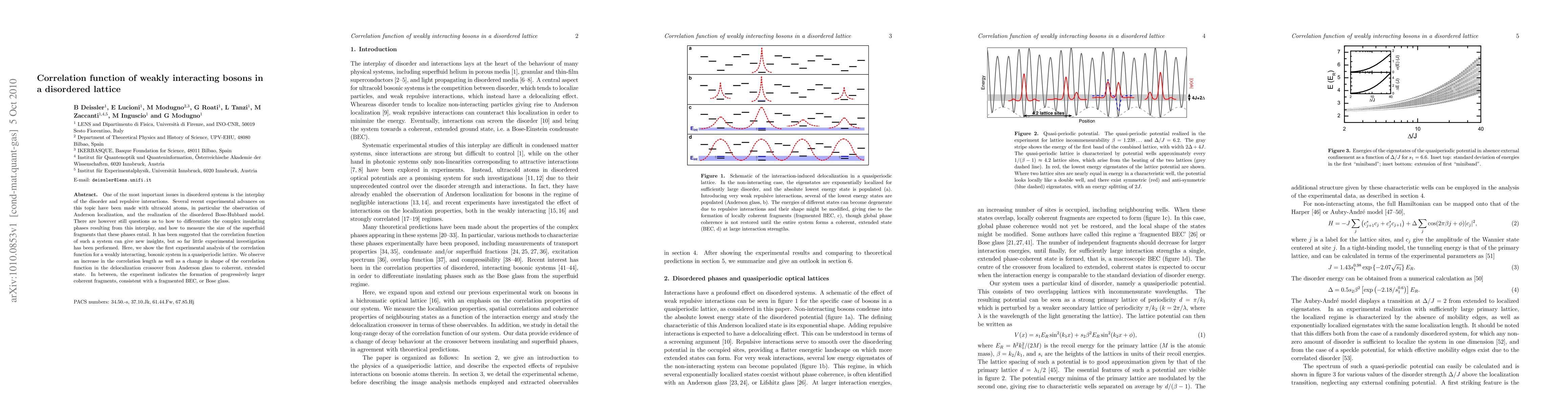 One of the most important issues in disordered systems is the interplay of the disorder and repulsive interactions. Several recent experimental advances on this topic have been made with ultracold atoms, in particular the observation of Anderson localization, and the realization of the disordered Bose-Hubbard model. There are however still questions as to how to differentiate the complex insulating phases resulting from this interplay, and how to measure the size of the superfluid fragments that these phases entail. It has been suggested that the correlation function of such a system can give new insights, but so far little experimental investigation has been performed. Here, we show the first experimental analysis of the correlation function for a weakly interacting, bosonic system in a quasiperiodic lattice. We observe an increase in the correlation length as well as a change in shape of the correlation function in the delocalization crossover from Anderson glass to coherent, extended state. In between, the experiment indicates the formation of progressively larger coherent fragments, consistent with a fragmented BEC, or Bose glass.