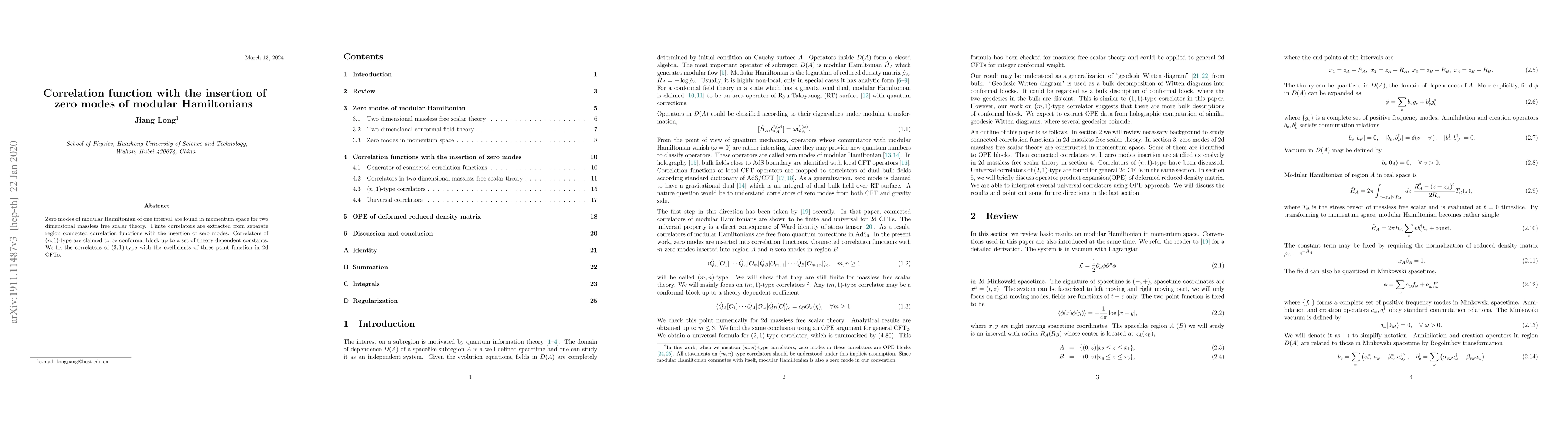 Research finds zero modes in modular Hamiltonians of 2D massless free scalar theory, leading to conformal block correlators with theory-dependent constants, which can be fixed using coefficients from 2D CFTs.