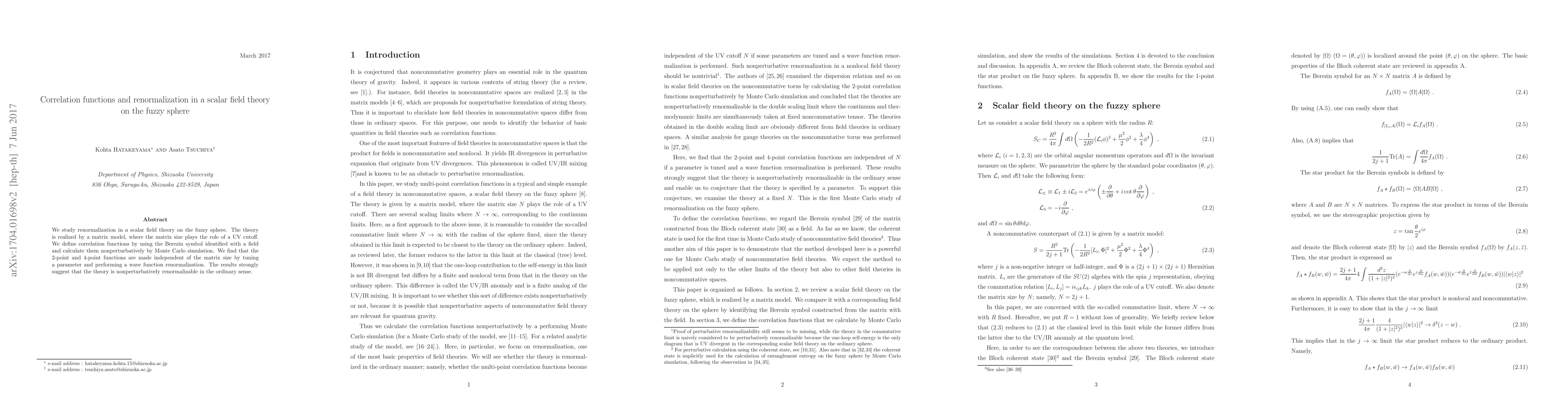 This paper investigates renormalization in a scalar field theory on a fuzzy sphere using a matrix model as a UV cutoff. Nonperturbative correlation functions are calculated via Monte Carlo simulations, revealing that 2-point and 4-point functions become independent of the matrix size through parameter tuning and wave function renormalization, indicating nonperturbative renormalizability.