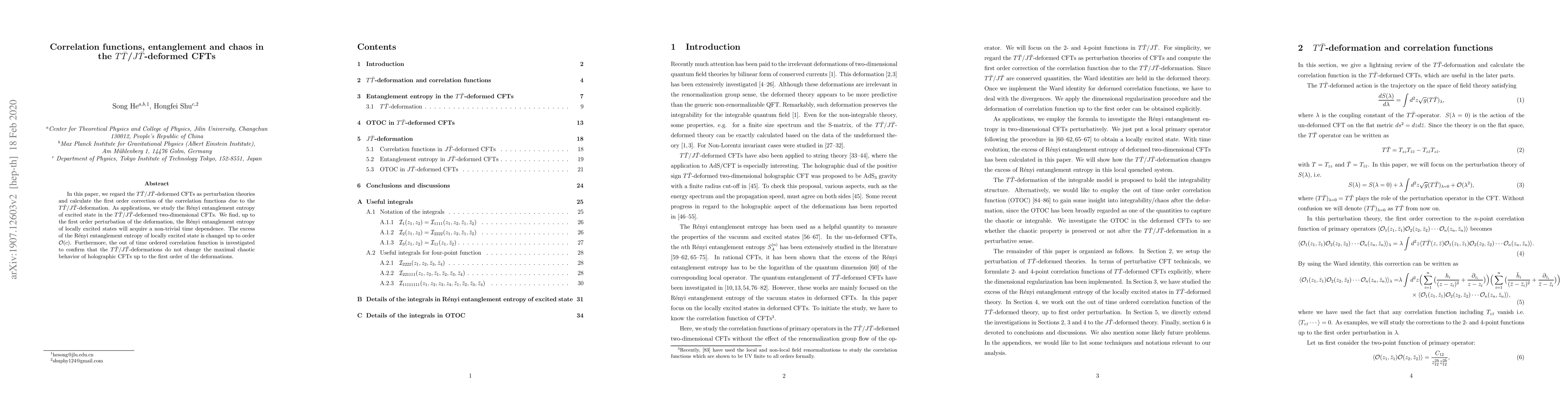This paper calculates the first-order correction to correlation functions in $T\bar{T}$/$J\bar{T}$-deformed CFTs and finds that the Rényi entanglement entropy of excited states acquires a non-trivial time dependence, while the out-of-time-ordered correlation function confirms that the maximal chaotic behavior remains unchanged.