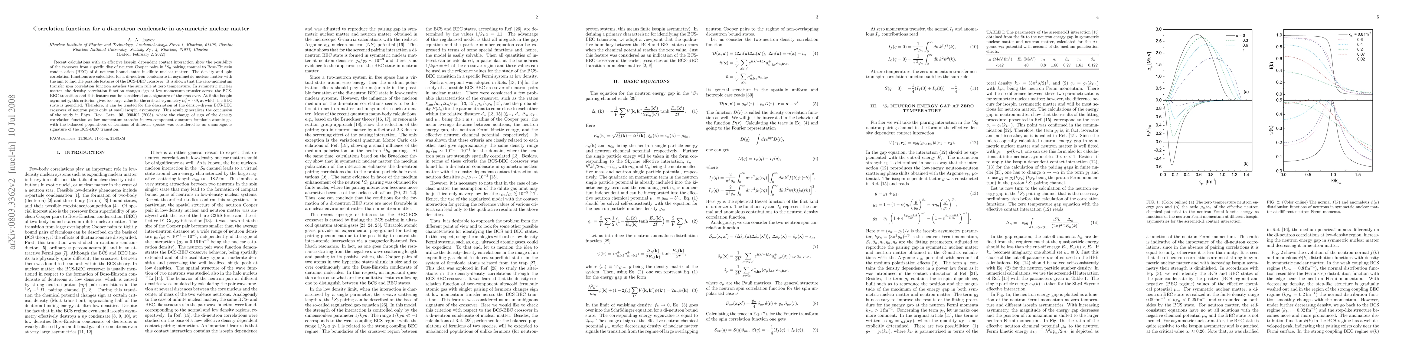 Recent calculations with an effective isospin dependent contact interaction show the possibility of the crossover from superfluidity of neutron Cooper pairs in $^1S_0$ pairing channel to Bose-Einstein condensation (BEC) of di-neutron bound states in dilute nuclear matter. The density and spin correlation functions are calculated for a di-neutron condensate in asymmetric nuclear matter with the aim to find the possible features of the BCS-BEC crossover. It is shown that the zero-momentum transfer spin correlation function satisfies the sum rule at zero temperature. In symmetric nuclear matter, the density correlation function changes sign at low momentum transfer across the BCS-BEC transition and this feature can be considered as a signature of the crossover. At finite isospin asymmetry, this criterion gives too large value for the critical asymmetry $\alpha_c^d\sim0.9$, at which the BEC state is quenched. Therefore, it can be trusted for the description of the density-driven BCS-BEC crossover of neutron pairs only at small isospin asymmetry. This result generalizes the conclusion of the study in Phys. Rev. Lett. {\bf 95}, 090402 (2005), where the change of sign of the density correlation function at low momentum transfer in two-component quantum fermionic atomic gas with the balanced populations of fermions of different species was considered as an unambiguous signature of the BCS-BEC transition.