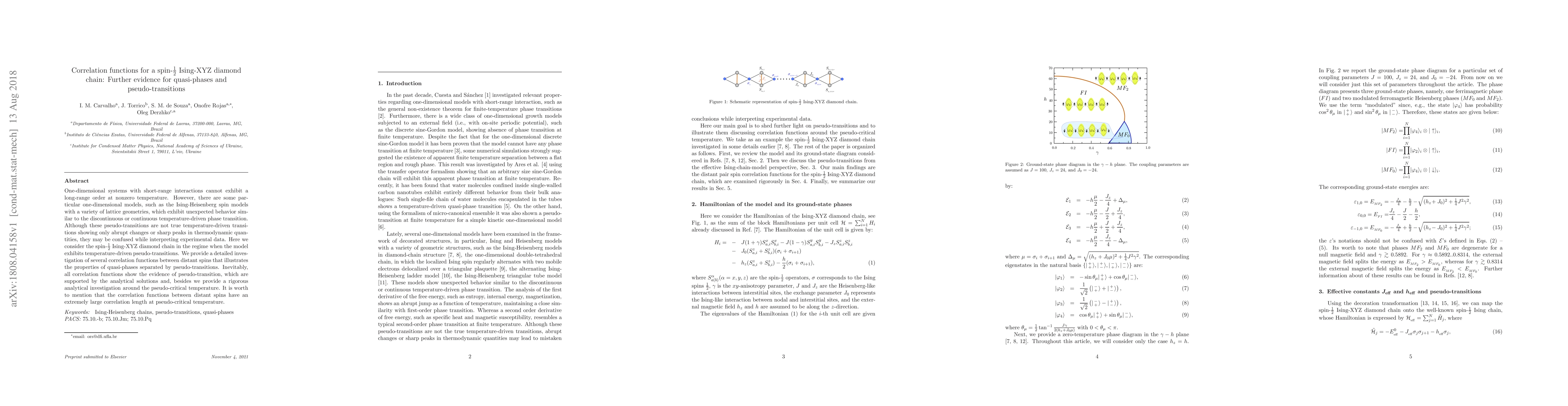 One-dimensional systems with short-range interactions cannot exhibit a long-range order at nonzero temperature. However, there are some particular one-dimensional models, such as the Ising-Heisenberg spin models with a variety of lattice geometries, which exhibit unexpected behavior similar to the discontinuous or continuous temperature-driven phase transition. Although these pseudo-transitions are not true temperature-driven transitions showing only abrupt changes or sharp peaks in thermodynamic quantities, they may be confused while interpreting experimental data. Here we consider the spin-$\frac{1}{2}$ Ising-XYZ diamond chain in the regime when the model exhibits temperature-driven pseudo-transitions. We provide a detailed investigation of several correlation functions between distant spins that illustrates the properties of quasi-phases separated by pseudo-transitions. Inevitably, all correlation functions show the evidence of pseudo-transition, which are supported by the analytical solutions and, besides we provide a rigorous analytical investigation around the pseudo-critical temperature. It is worth to mention that the correlation functions between distant spins have an extremely large correlation length at pseudo-critical temperature.