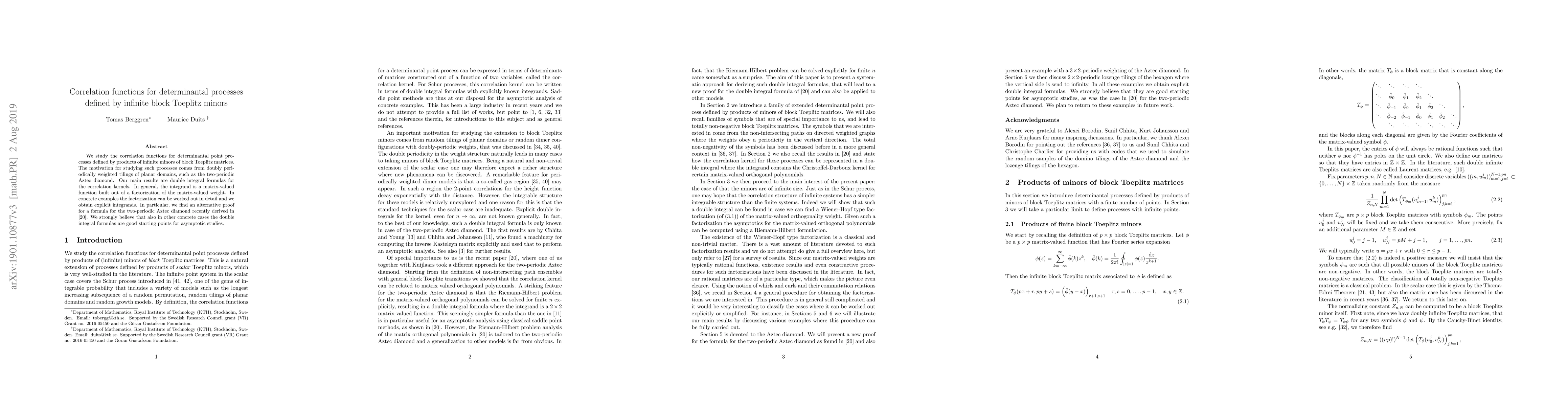 The paper introduces a method for calculating correlation functions of determinantal point processes defined by infinite block Toeplitz minors, leading to alternative proofs for certain formulas in concrete examples like the Aztec diamond.
