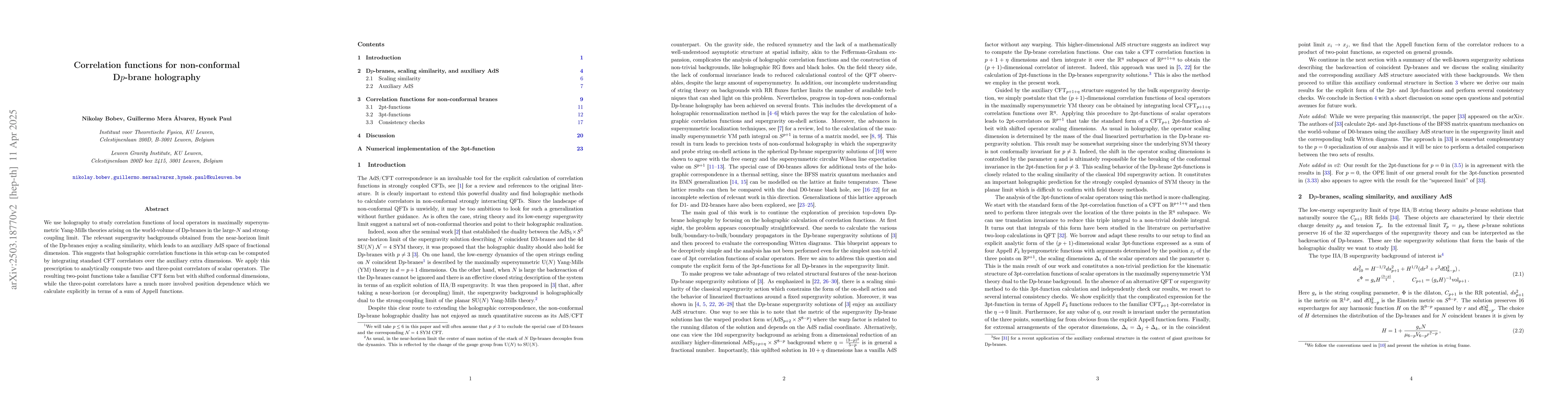 The work presents a unique approach to holographic correlation functions in non-conformal Dp-brane theories, offering detailed computations for two- and three-point functions involving complex position dependence through Appell functions.