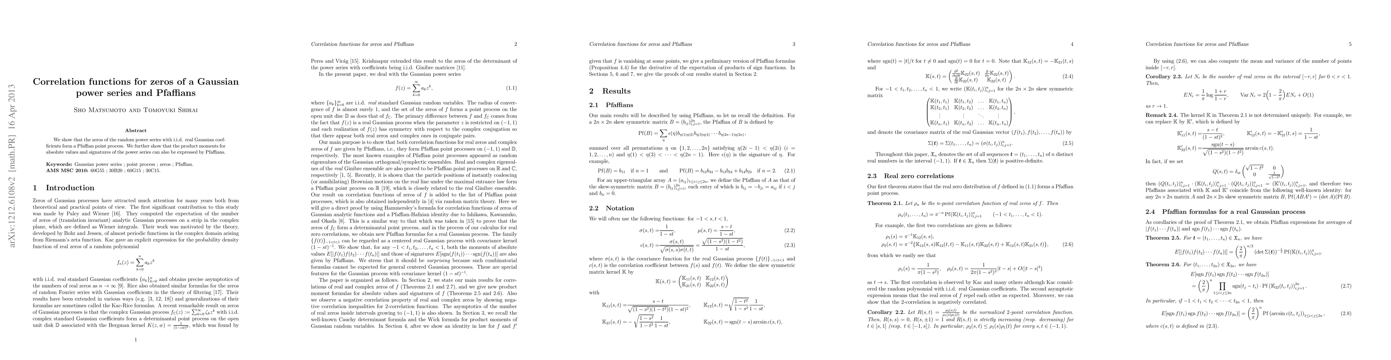 This paper demonstrates that the zeros of a Gaussian power series with independent and identically distributed Gaussian coefficients form a Pfaffian point process. Additionally, the study reveals that the product moments of the series' absolute values and signatures can be represented using Pfaffians.