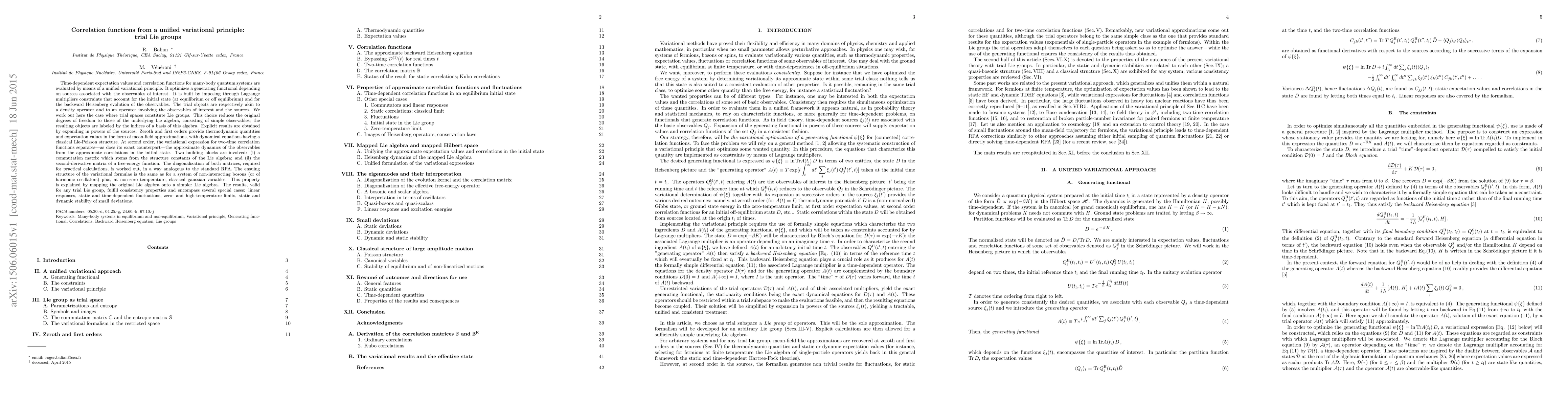 This paper proposes a unified variational principle to evaluate time-dependent expectation values and correlation functions for many-body quantum systems, optimizing a generating functional linked to the observables of interest. The approach leverages trial Lie groups to enhance the accuracy of the calculations.