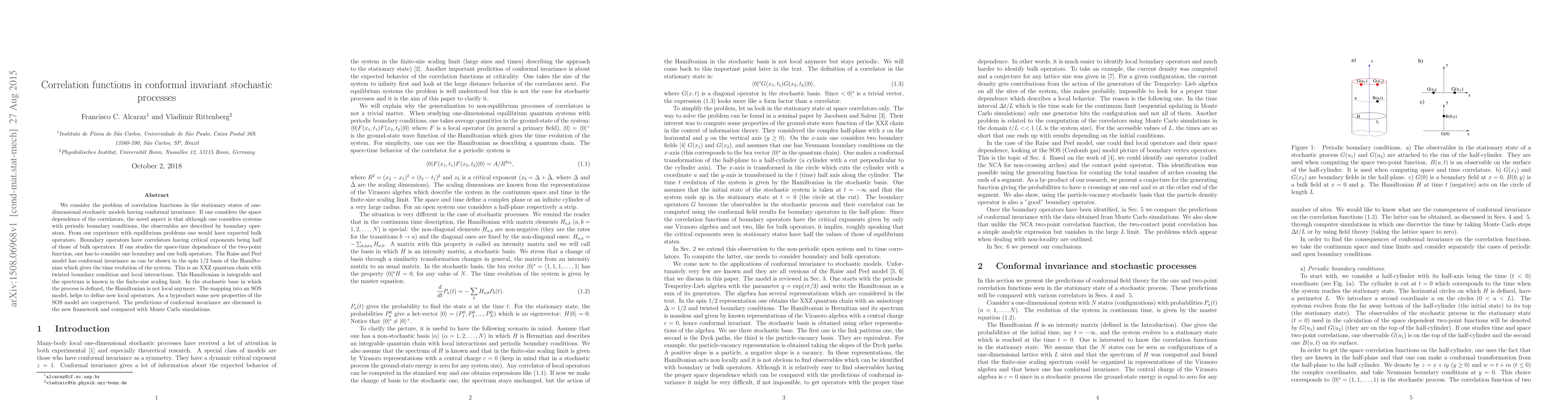 We consider the problem of correlation functions in the stationary states of one-dimensional stochastic models having conformal invariance. If one considers the space dependence of the correlators, the novel aspect is that although one considers systems with periodic boundary conditions, the observables are described by boundary operators. From our experience with equilibrium problems one would have expected bulk operators. Boundary operators have correlators having critical exponents being half of those of bulk operators. If one studies the space-time dependence of the two-point function, one has to consider one boundary and one bulk operators. The Raise and Peel model has conformal invariance as can be shown in the spin 1/2 basis of the Hamiltonian which gives the time evolution of the system. This is an XXZ quantum chain with twisted boundary condition and local interactions. This Hamiltonian is integrable and the spectrum is known in the finite-size scaling limit. In the stochastic base in which the process is defined, the Hamiltonian is not local anymore. The mapping into an SOS model, helps to define new local operators. As a byproduct some new properties of the SOS model are conjectured. The predictions of conformal invariance are discussed in the new framework and compared with Monte Carlo simulations.