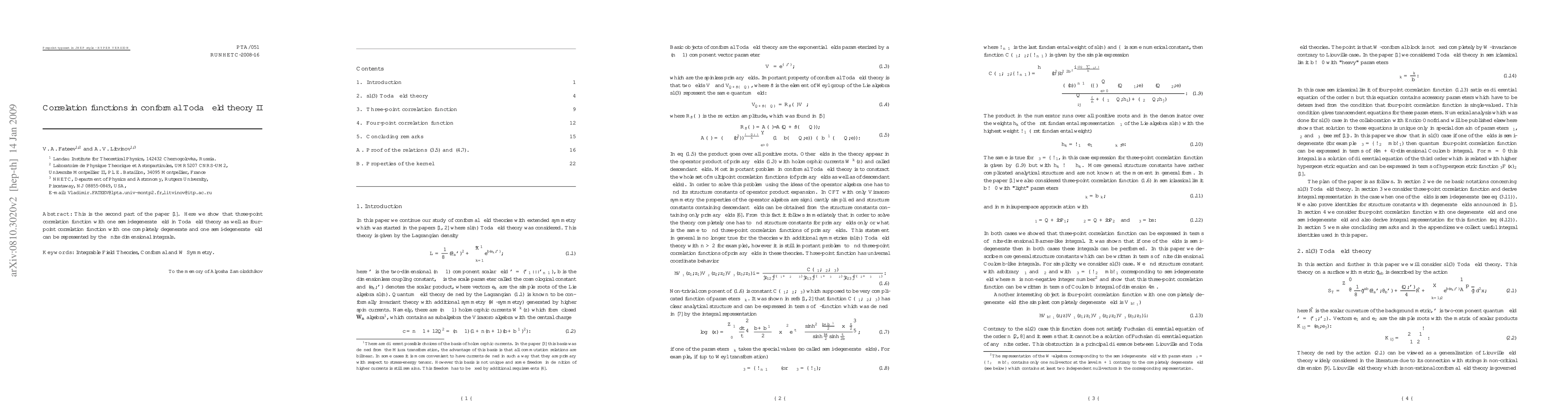 This is the second part of the paper 0709.3806v2. Here we show that three-point correlation function with one semi-degenerate field in Toda field theory as well as four-point correlation function with one completely degenerate and one semi-degenerate field can be represented by the finite dimensional integrals.