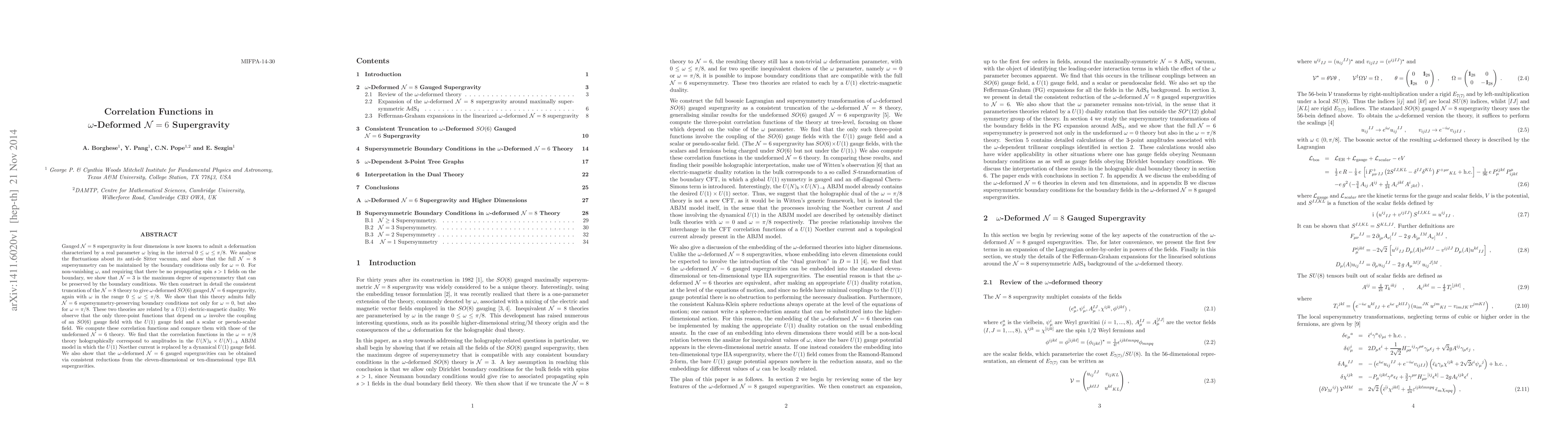 Gauged N=8 supergravity in four dimensions is now known to admit a deformation characterized by a real parameter $\omega$ lying in the interval $0\le\omega\le \pi/8$. We analyse the fluctuations about its anti-de Sitter vacuum, and show that the full N=8 supersymmetry can be maintained by the boundary conditions only for $\omega=0$. For non-vanishing $\omega$, and requiring that there be no propagating spin s>1 fields on the boundary, we show that N=3 is the maximum degree of supersymmetry that can be preserved by the boundary conditions. We then construct in detail the consistent truncation of the N=8 theory to give $\omega$-deformed SO(6) gauged N=6 supergravity, again with $\omega$ in the range $0\le\omega\le \pi/8$. We show that this theory admits fully N=6 supersymmetry-preserving boundary conditions not only for $\omega=0$, but also for $\omega=\pi/8$. These two theories are related by a U(1) electric-magnetic duality. We observe that the only three-point functions that depend on $\omega$ involve the coupling of an SO(6) gauge field with the U(1) gauge field and a scalar or pseudo-scalar field. We compute these correlation functions and compare them with those of the undeformed N=6 theory. We find that the correlation functions in the $\omega=\pi/8$ theory holographically correspond to amplitudes in the U(N)_k x U(N)_{-k} ABJM model in which the U(1) Noether current is replaced by a dynamical U(1) gauge field. We also show that the $\omega$-deformed N=6 gauged supergravities can be obtained via consistent reductions from the eleven-dimensional or ten-dimensional type IIA supergravities.