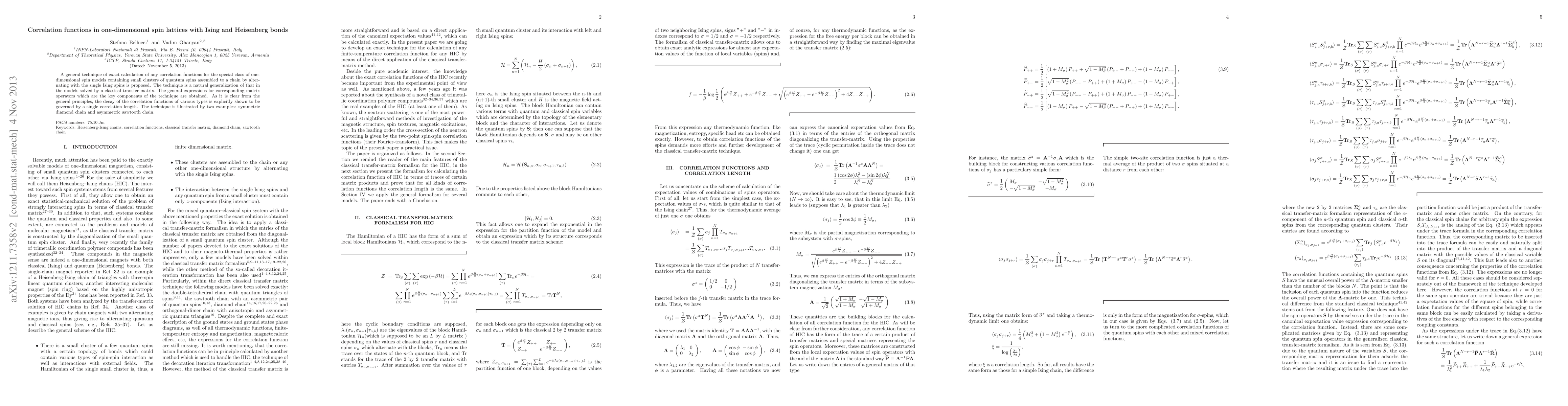 This paper proposes a method for calculating correlation functions in one-dimensional spin lattices with alternating Ising and Heisenberg bonds, generalizing classical transfer matrix techniques. The method reveals a single correlation length governing the decay of various correlation functions, demonstrated through examples of symmetric diamond and asymmetric sawtooth chains.
