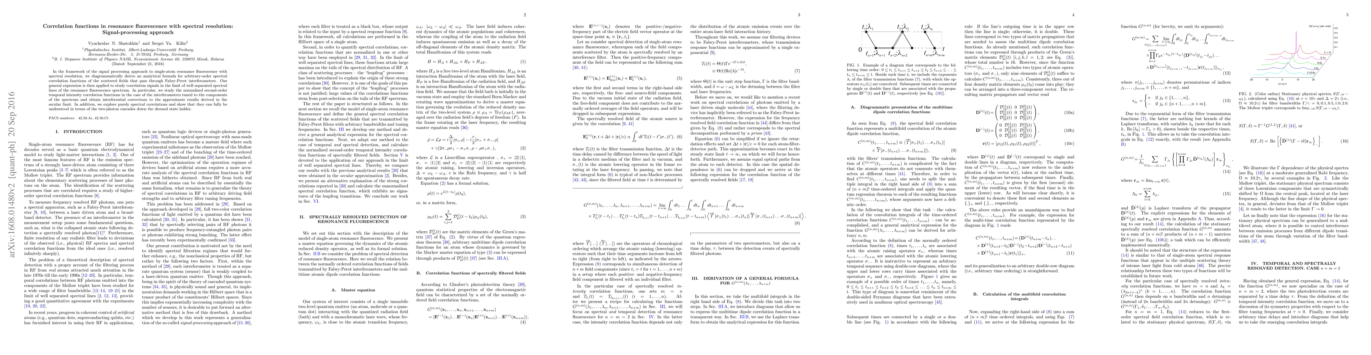 This paper derives an analytical formula for spectral correlation functions in single-atom resonance fluorescence using signal processing, focusing on the second-order temporal intensity correlations through Fabry-Perot interferometers. It reveals interferential corrections and explains purely spectral correlations in terms of two-photon cascades.