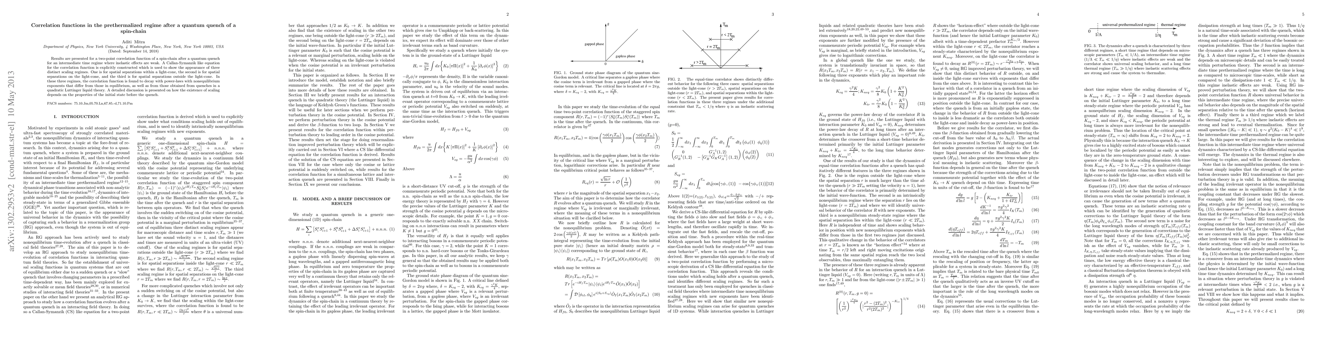 Results are presented for a two-point correlation function of a spin-chain after a quantum quench for an intermediate time regime where inelastic effects are weak. A Callan-Symanzik like equation for the correlation function is explicitly constructed which is used to show the appearance of three distinct scaling regimes. One is for spatial separations within a light-cone, the second is for spatial separations on the light-cone, and the third is for spatial separations outside the light-cone. In these three regimes, the correlation function is found to decay with power-laws with nonequilibrium exponents that differ from those in equilibrium, as well as from those obtained from quenches in a quadratic Luttinger liquid theory. A detailed discussion is presented on how the existence of scaling depends on the properties of the initial state before the quench.