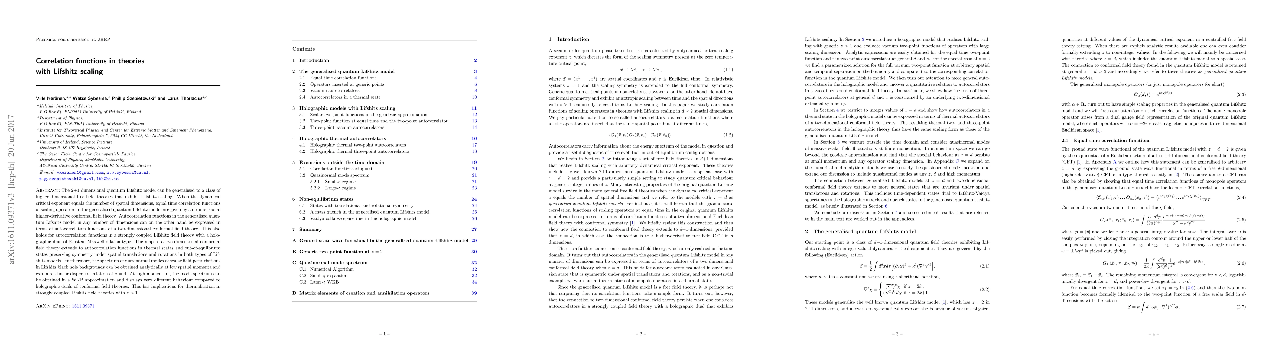 The 2+1 dimensional quantum Lifshitz model can be generalised to a class of higher dimensional free field theories that exhibit Lifshitz scaling. When the dynamical critical exponent equals the number of spatial dimensions, equal time correlation functions of scaling operators in the generalised quantum Lifshitz model are given by a d-dimensional higher-derivative conformal field theory. Autocorrelation functions in the generalised quantum Lifshitz model in any number of dimensions can on the other hand be expressed in terms of autocorrelation functions of a two-dimensional conformal field theory. This also holds for autocorrelation functions in a strongly coupled Lifshitz field theory with a holographic dual of Einstein-Maxwell-dilaton type. The map to a two-dimensional conformal field theory extends to autocorrelation functions in thermal states and out- of-equilbrium states preserving symmetry under spatial translations and rotations in both types of Lifshitz models. Furthermore, the spectrum of quasinormal modes of scalar field perturbations in Lifshitz black hole backgrounds can be obtained analytically at low spatial momenta and exhibits a linear dispersion relation at z = d. At high momentum, the mode spectrum can be obtained in a WKB approximation and displays very different behaviour compared to holographic duals of conformal field theories. This has implications for thermalisation in strongly coupled Lifshitz field theories with z > 1.