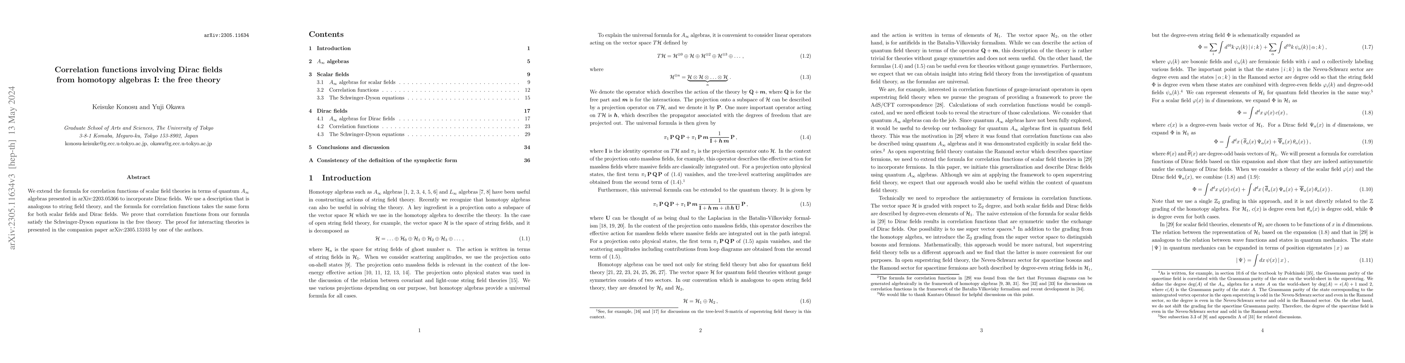 This paper extends the formula for correlation functions of scalar fields to incorporate Dirac fields using homotopy algebras, analogous to string field theory, and proves that these functions satisfy the Schwinger-Dyson equations in the free theory. The companion paper extends this to interacting theories.