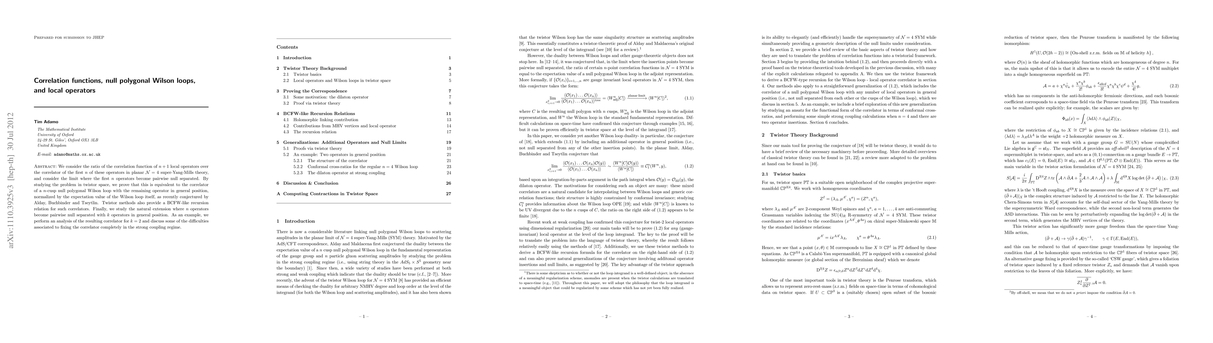 This paper examines the correlation functions of local operators in N=4 super-Yang-Mills theory, demonstrating their equivalence to n-cusp null polygonal Wilson loops via twistor space. It also introduces a BCFW-like recursion relation and explores the correlation for configurations with some operators in general position, analyzing the case with two such operators.