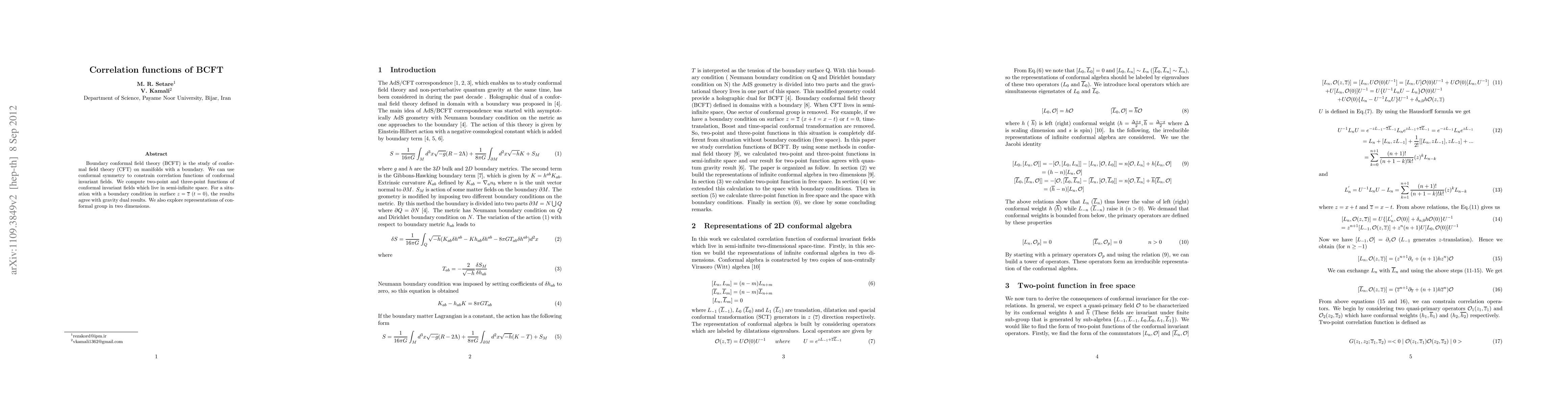 This paper investigates boundary conformal field theory (BCFT) by computing two-point and three-point correlation functions of conformal invariant fields on semi-infinite space. The results for boundary conditions on the surface $z=\bar{z}$ ($t=0$) align with gravity dual findings, and it examines representations of the conformal group in two dimensions.