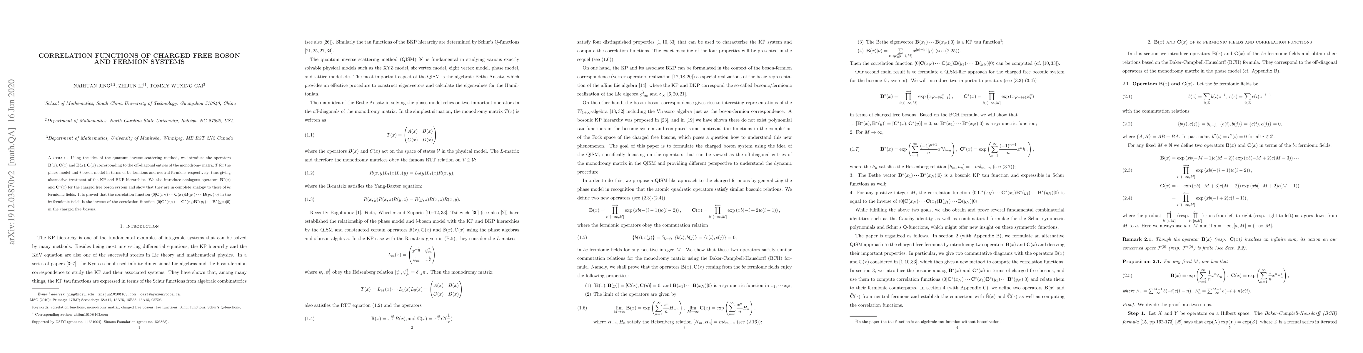 Using the idea of the quantum inverse scattering method, we introduce the operators $\mathbf{B}(x), \mathbf{C}(x)$ and $\mathbf{\tilde{B}}(x), \mathbf{\tilde{C}}(x)$ corresponding to the off-diagonal entries of the monodromy matrix $T$ for the phase model and $i$-boson model in terms of bc fermions and neutral fermions respectively, thus giving alternative treatment of the KP and BKP hierarchies. We also introduce analogous operators $\mathbf{B}^{*}(x)$ and $\mathbf{C}^{*}(x)$ for the charged free boson system and show that they are in complete analogy to those of $bc$ fermionic fields. It is proved that the correlation function $\langle 0|\mathbf{C}(x_N)\cdots\mathbf{C}(x_1)\mathbf{B}(y_1)\cdots $ $\mathbf{B}(y_N)|0\rangle$ in the $bc$ fermionic fields is the inverse of the correlation function $\langle 0|\mathbf{C}^{*}(x_N)\cdots\mathbf{C}^{*}(x_1)\mathbf{B}^{*}(y_1)\cdots \mathbf{B}^{*}(y_N)|0\rangle$ in the charged free bosons.