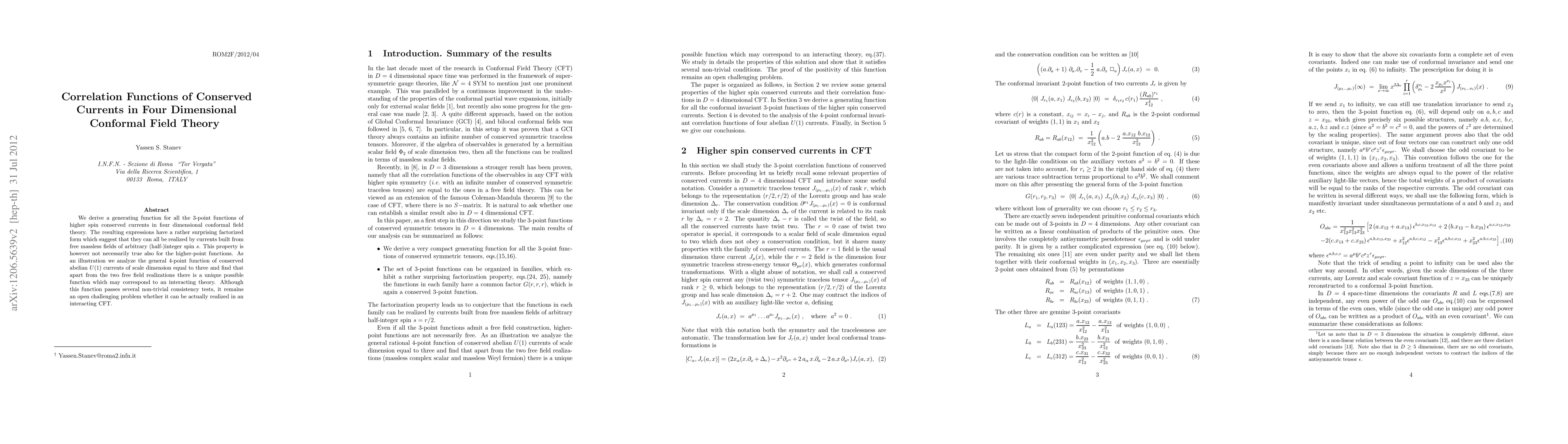 This paper derives a generating function for 3-point functions of higher spin conserved currents in four-dimensional conformal field theory, revealing a surprising factorized form suggesting realizations from free massless fields. It also examines 4-point functions of conserved U(1) currents, identifying a unique non-free field possibility that passes consistency tests but remains unrealized in interacting conformal field theories.