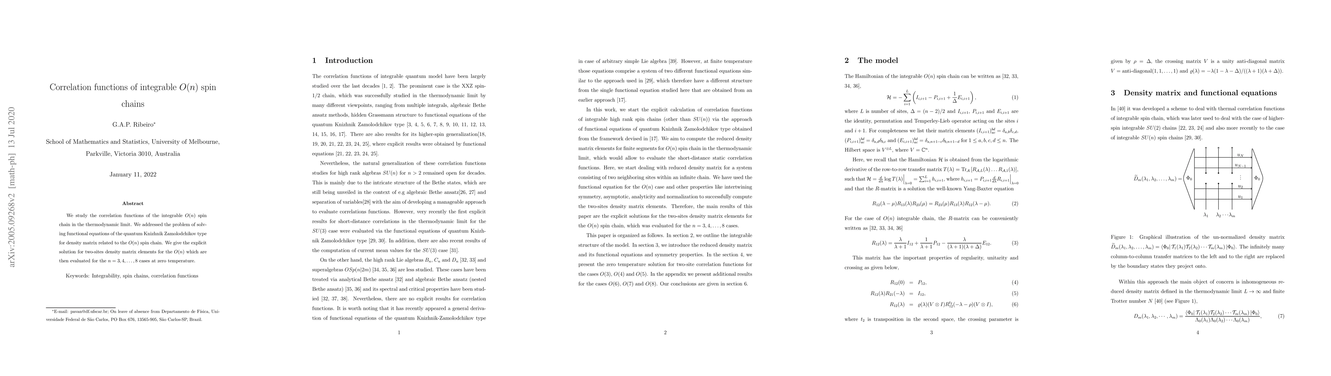 This paper investigates the correlation functions of integrable $O(n)$ spin chains in the thermodynamic limit, solving quantum Knizhnik Zamolodchikov equations for the density matrix, and provides explicit solutions for two-sites density matrix elements for $n=3$ to $8$ at zero temperature.