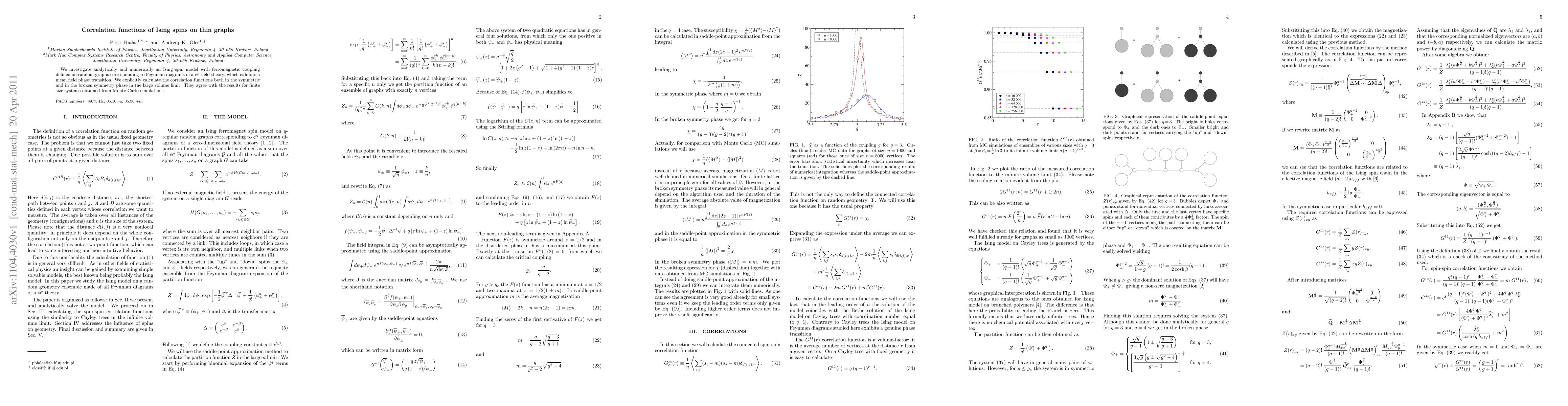 This paper analytically and numerically studies an Ising spin model on random graphs representing Feynman diagrams, finding mean field phase transition behavior. The correlation functions calculated in both symmetric and broken symmetry phases match Monte Carlo simulation results for finite-size systems.