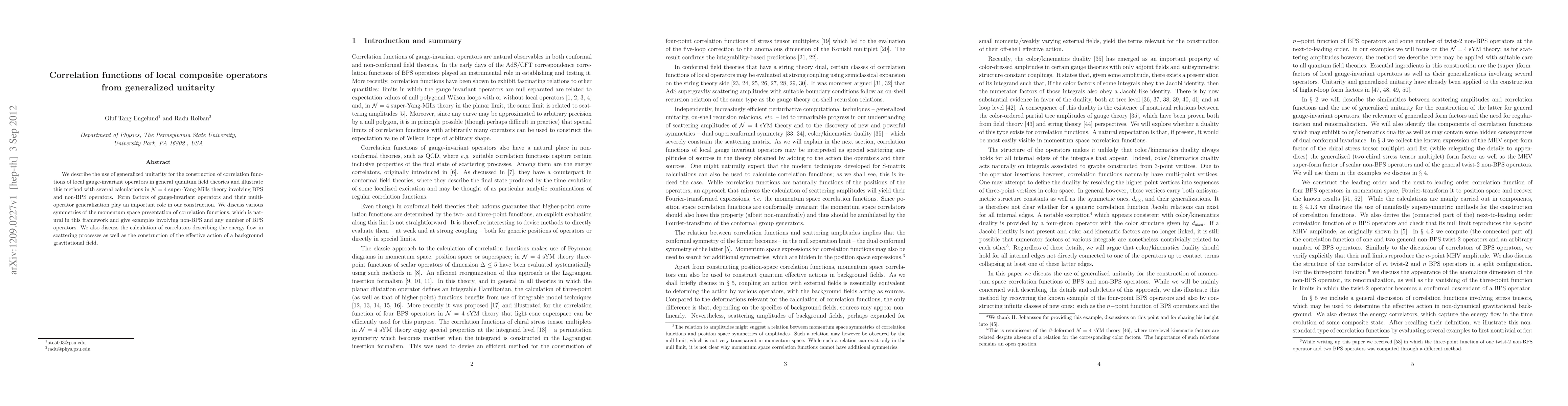 This paper presents a method using generalized unitarity to construct correlation functions of local gauge-invariant operators in quantum field theories, exemplified in N=4 super-Yang-Mills. The approach employs form factors and their multi-operator generalizations, uncovering symmetries in momentum space presentations of correlation functions involving BPS and non-BPS operators. It also discusses calculations for energy flow in scattering processes and effective action of gravitational fields.