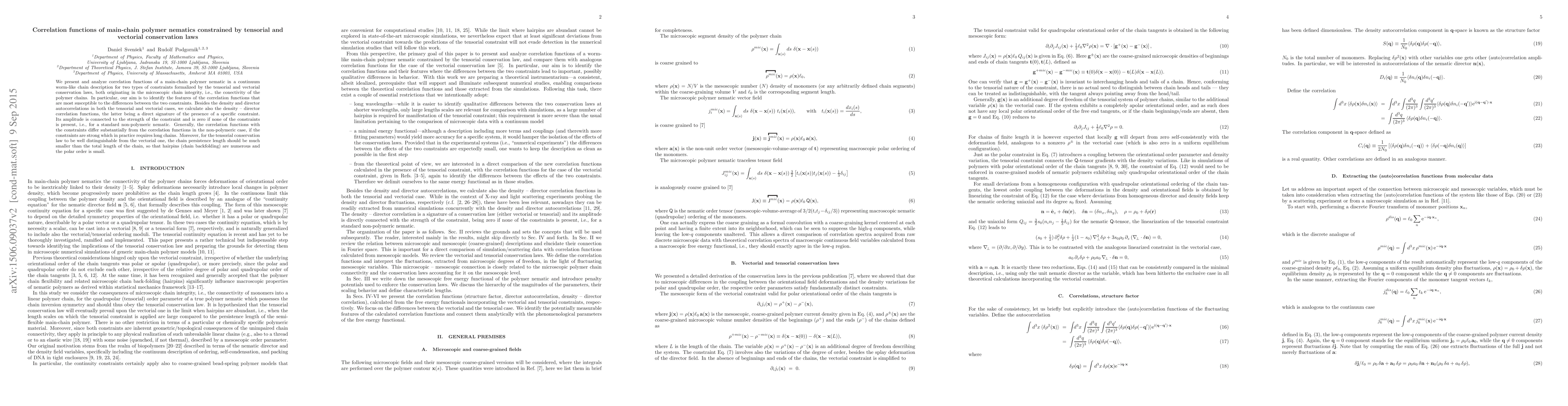 This paper investigates correlation functions of main-chain polymer nematics under tensorial and vectorial conservation laws, revealing significant differences in correlation functions due to the presence of these constraints, especially for long chains and when chain persistence length is much smaller than the total chain length. The density-director correlation functions highlight the influence of the specific constraints.