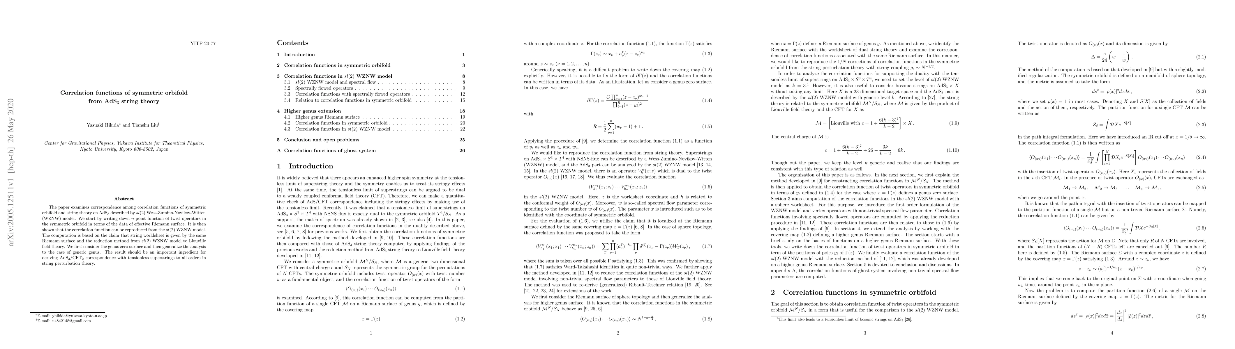 The paper examines correspondence among correlation functions of symmetric orbifold and string theory on AdS3 described by sl(2) Wess-Zumino-Novikov-Witten (WZNW) model. We start by writing down n-point function of twist operators in the symmetric orbifold in terms of the data of effective Riemann surface. It is then shown that the correlation function can be reproduced from the sl(2) WZNW model. The computation is based on the claim that string worldsheet is given by the same Riemann surface and the reduction method from sl(2) WZNW model to Liouville field theory. We first consider the genus zero surface and then generalize the analysis to the case of generic genus. The result should be an important ingredient for deriving AdS$_3$/CFT$_2$ correspondence with tensionless superstrings to all orders in string perturbation theory.