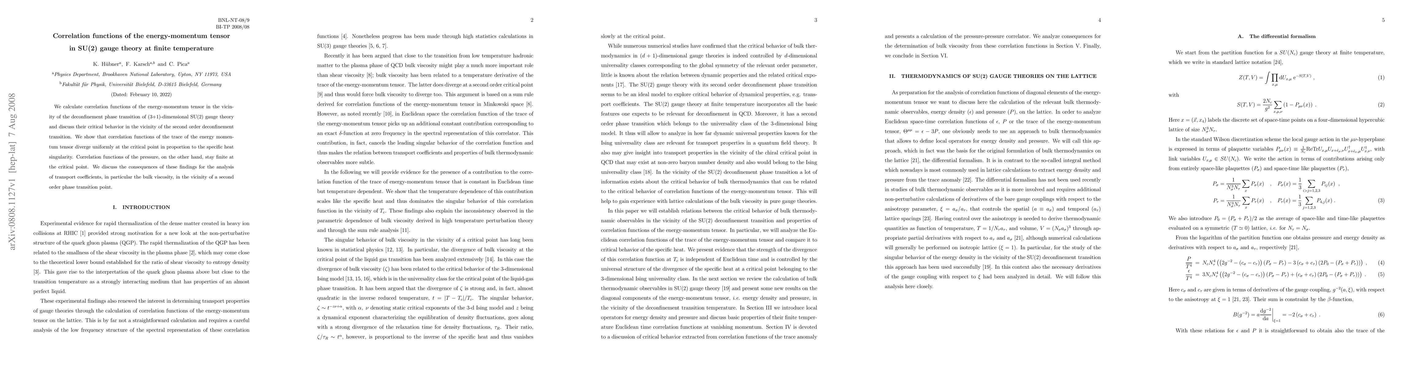 This paper calculates correlation functions of the energy-momentum tensor in SU(2) gauge theory at finite temperature, revealing critical behavior near the deconfinement phase transition. It finds that trace correlations diverge proportionally to the specific heat singularity, while pressure correlations remain finite.