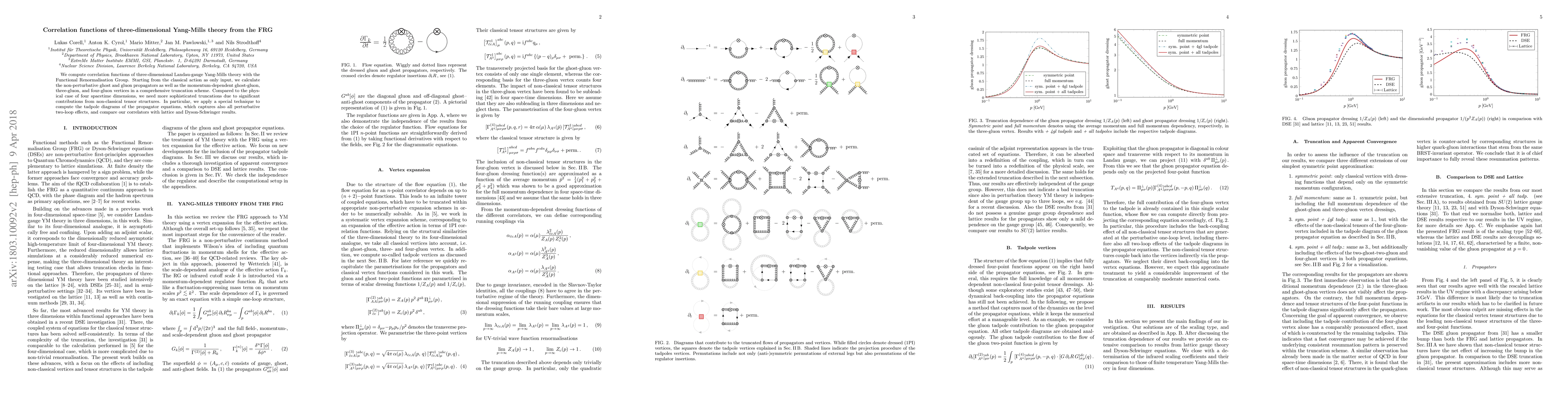This paper computes correlation functions for three-dimensional Yang-Mills theory using the Functional Renormalisation Group (FRG), focusing on non-perturbative ghost and gluon propagators and vertices. The study employs a special technique to account for non-classical tensor structures and perturbative two-loop effects, comparing results with lattice and Dyson-Schwinger approaches.