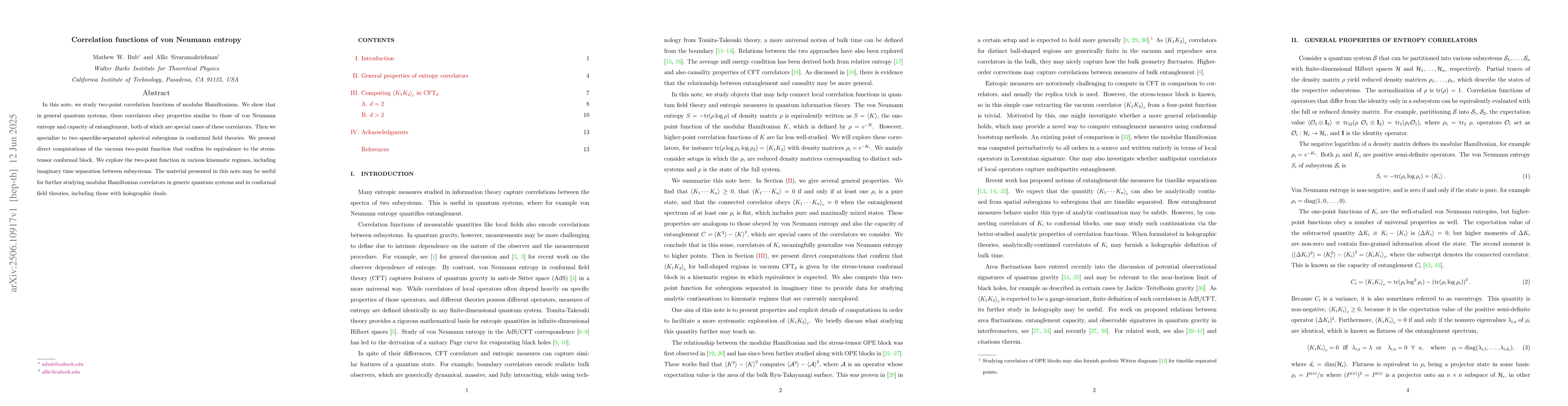 The research investigates two-point correlation functions of modular Hamiltonians, showing their properties align with those of von Neumann entropy and capacity of entanglement, which are special cases of these correlators. The study specializes to two spacelike-separated spherical subregions in conformal field theories, presenting direct computations of the vacuum two-point function confirming its equivalence to the stress-tensor conformal block.