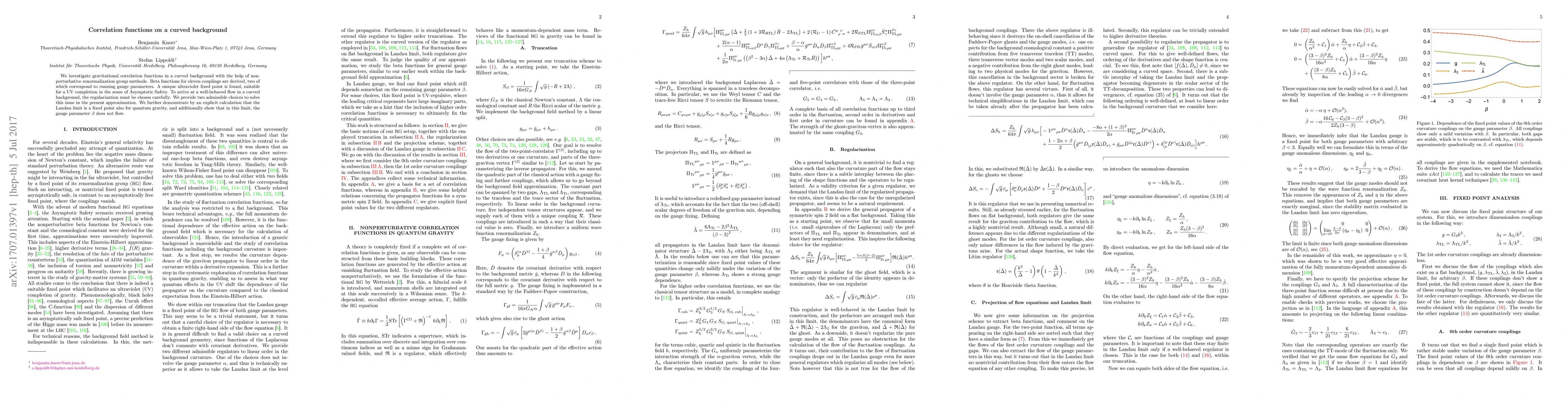 This paper explores gravitational correlation functions in curved backgrounds using nonperturbative renormalization group methods, deriving beta functions for eleven couplings and identifying a unique ultraviolet fixed point for Asymptotic Safety. Two suitable regularization methods are proposed to ensure a well-behaved flow, and it is shown that the Landau limit is a fixed point for quantum gravity, with the gauge parameter $\beta$ not flowing in this limit.