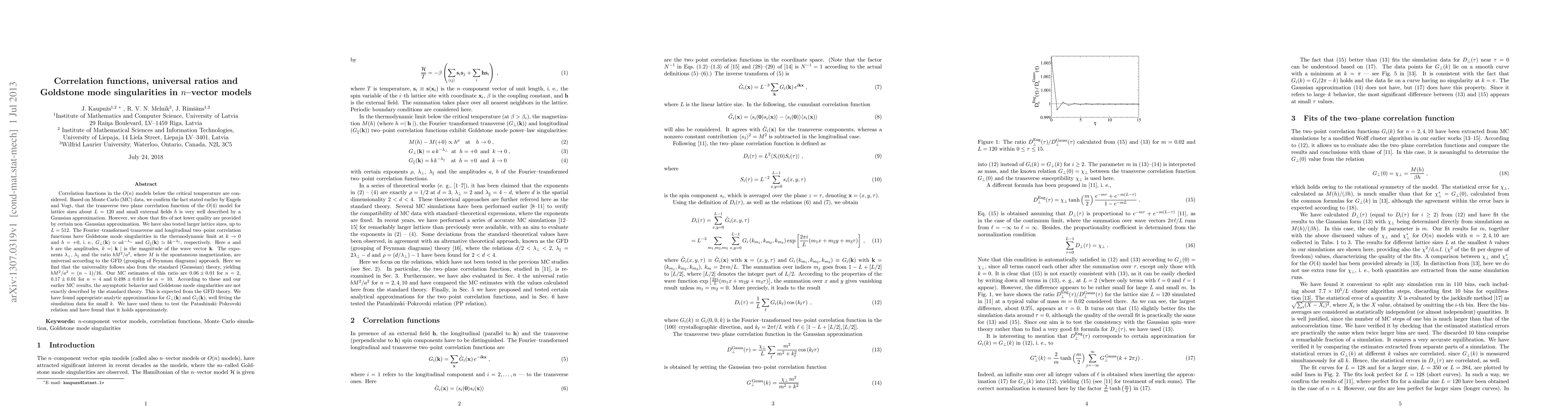 This paper investigates correlation functions in n-vector models below critical temperature, confirming Gaussian approximations for some models and identifying universal ratios and Goldstone mode singularities.