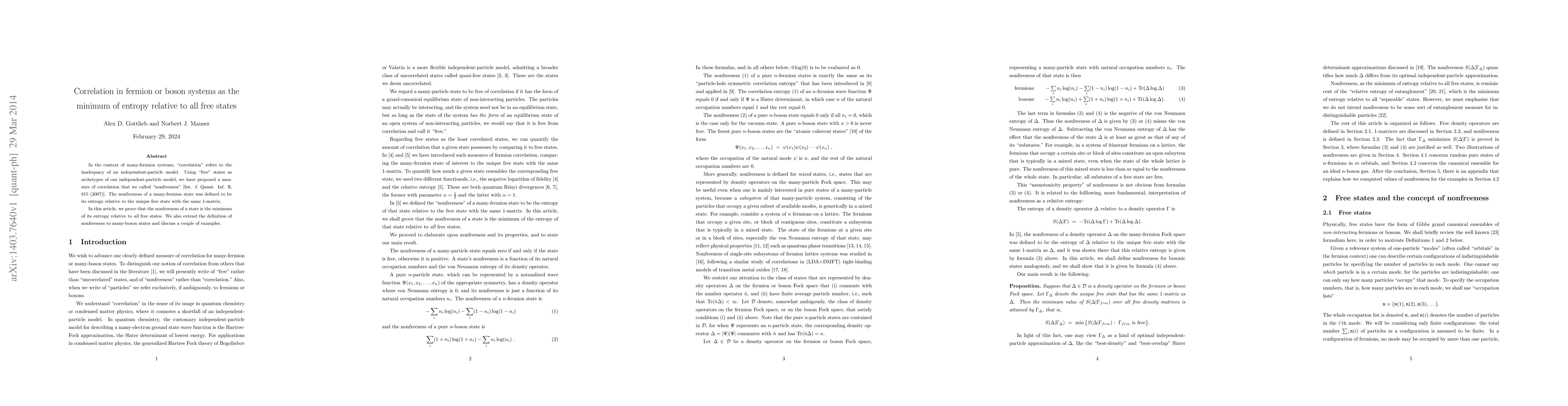 This paper introduces 'nonfreeness' as a measure of correlation in many-fermion systems, defined as a state's entropy relative to the nearest free state with the same 1-matrix. The research proves that nonfreeness is the minimum entropy relative to all free states and extends this definition to many-boson systems.