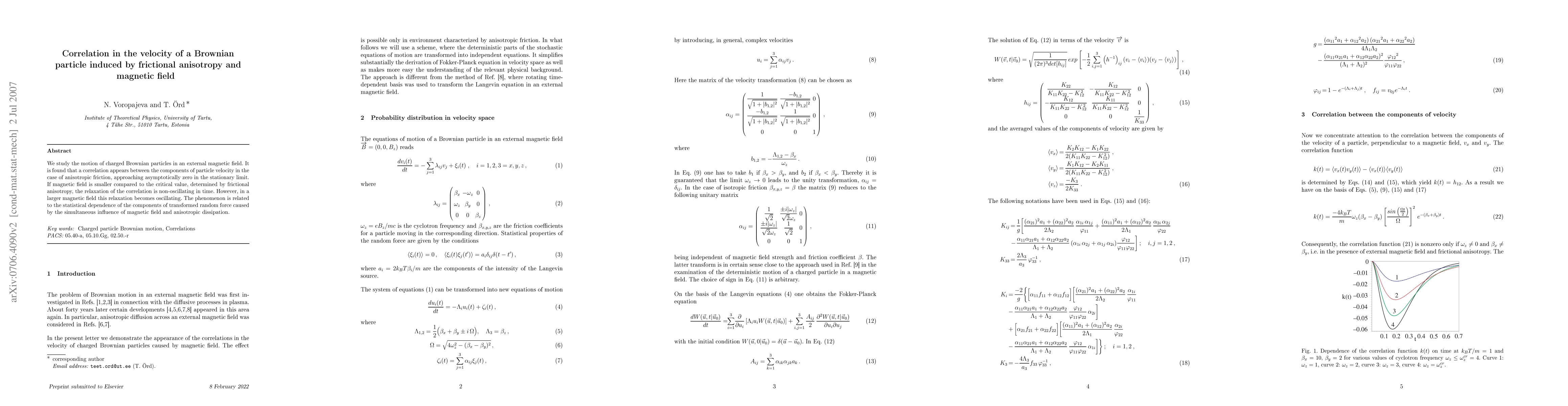This paper investigates the motion of charged Brownian particles in a magnetic field, revealing a correlation between velocity components under anisotropic friction. The correlation relaxes non-oscillatingly if the magnetic field is below a critical value, but oscillates when it exceeds this value, due to the statistical dependence of the transformed random force.