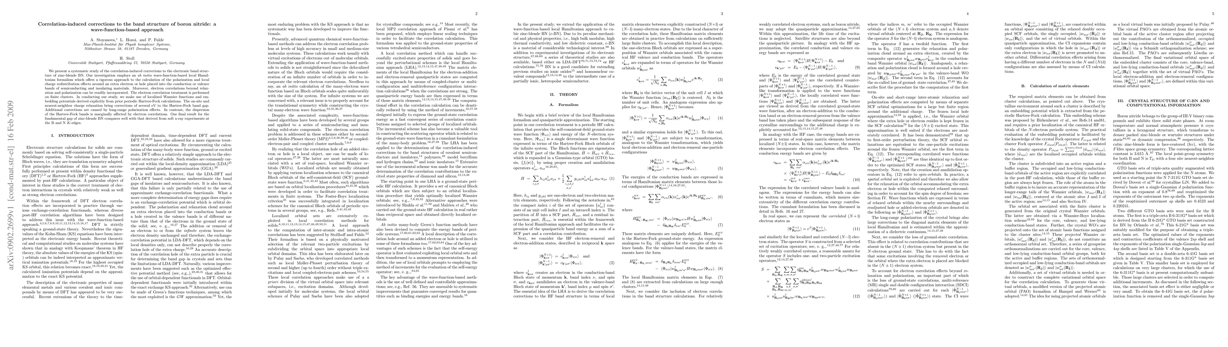 This paper investigates the correlation-induced corrections to the electronic band structure of zinc-blende boron nitride using an ab initio wave-function-based local Hamiltonian formalism. The study finds significant corrections to the Hartree-Fock band gap due to on-site and nearest-neighbor charge relaxation, but minimal impact on band dispersion.