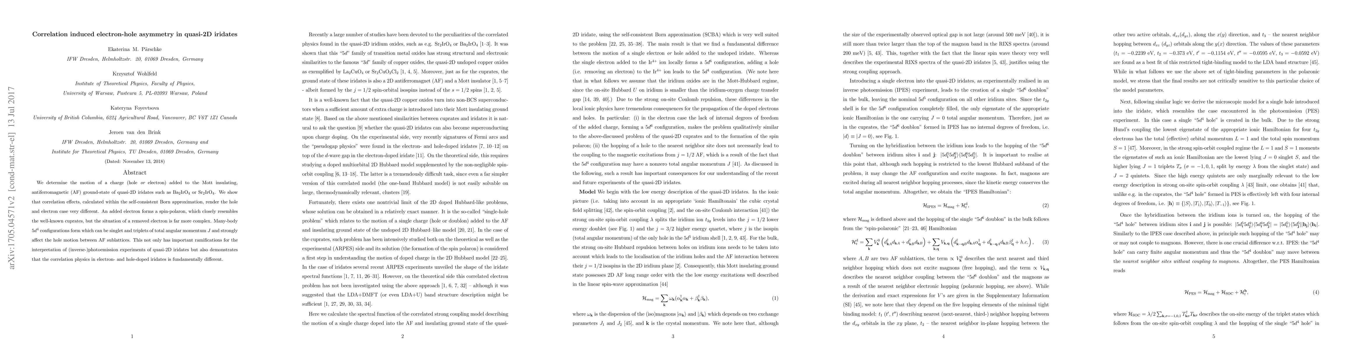 This paper investigates the distinct behaviors of electrons and holes in quasi-2D iridates, revealing that correlation effects lead to significant differences. An added electron forms a spin-polaron, while removing an electron creates complex many-body configurations affecting hole motion, highlighting fundamentally different correlation physics in electron- and hole-doped iridates.