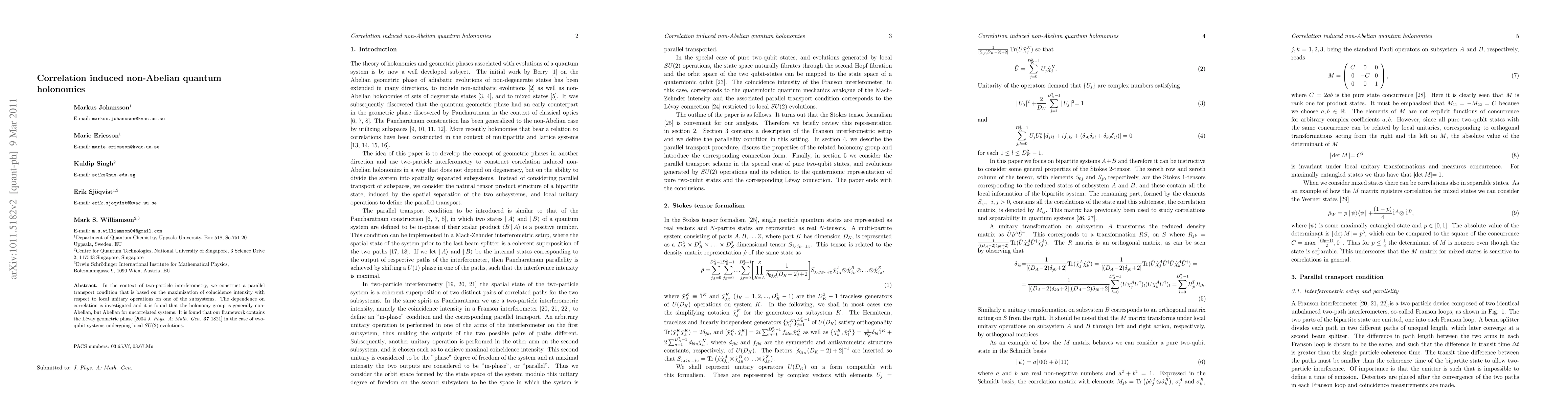 In the context of two-particle interferometry, we construct a parallel transport condition that is based on the maximization of coincidence intensity with respect to local unitary operations on one of the subsystems. The dependence on correlation is investigated and it is found that the holonomy group is generally non-Abelian, but Abelian for uncorrelated systems. It is found that our framework contains the L\'{e}vay geometric phase [2004 {\it J. Phys. A: Math. Gen.} {\bf 37} 1821] in the case of two-qubit systems undergoing local SU(2) evolutions.