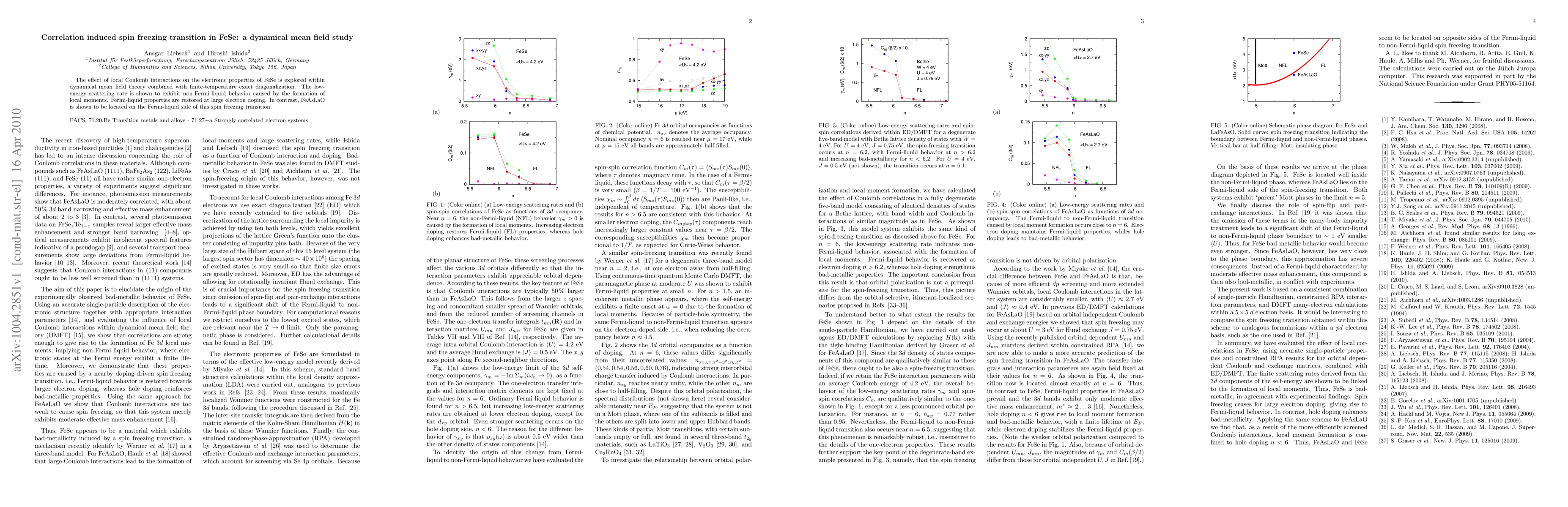 FeSe exhibits non-Fermi-liquid behavior due to spin freezing transitions induced by local Coulomb interactions, but restoring Fermi-liquid properties at high electron doping.