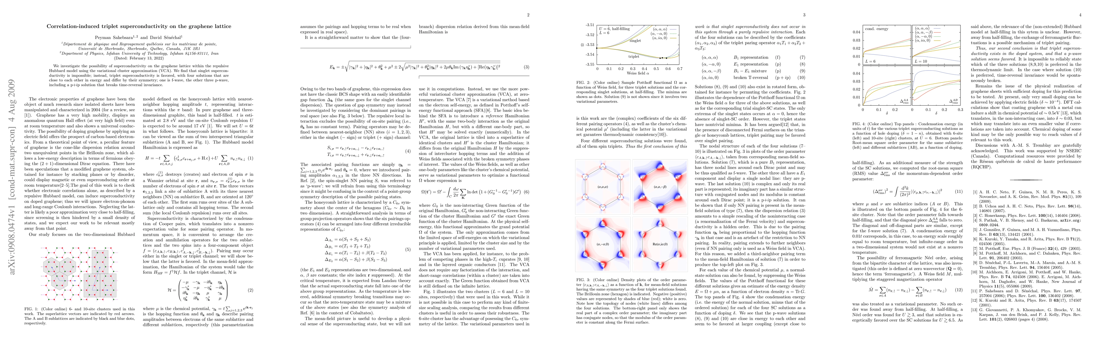This study explores superconductivity on graphene using the variational cluster approximation, finding that triplet superconductivity is favored over singlet, with four nearly-equal energy solutions including f-wave and p-wave symmetries, including a unique p+ip solution that breaks time-reversal symmetry.