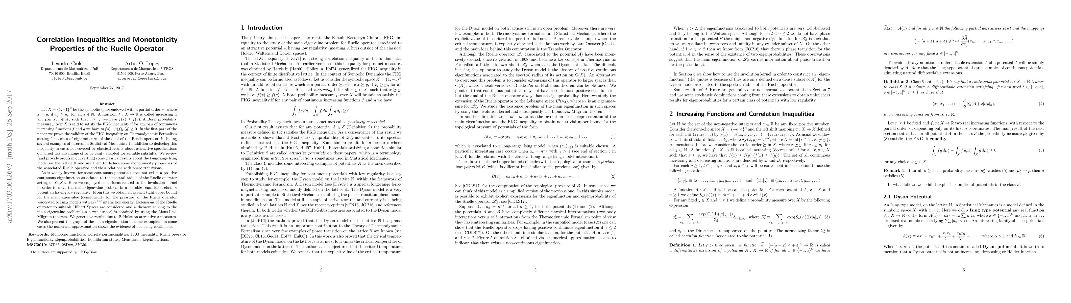 This paper proves the FKG inequality for a class of eigenmeasures of the dual Ruelle operator in the context of Statistical Mechanics, extending classical results and adapting them to specific subshifts. It also addresses the main eigenvalue problem for low-regularity potentials, providing an explicit upper bound for the Ruelle operator in Ising models and extending the operator to Hilbert spaces using the Lions-Lax-Milgram theorem.