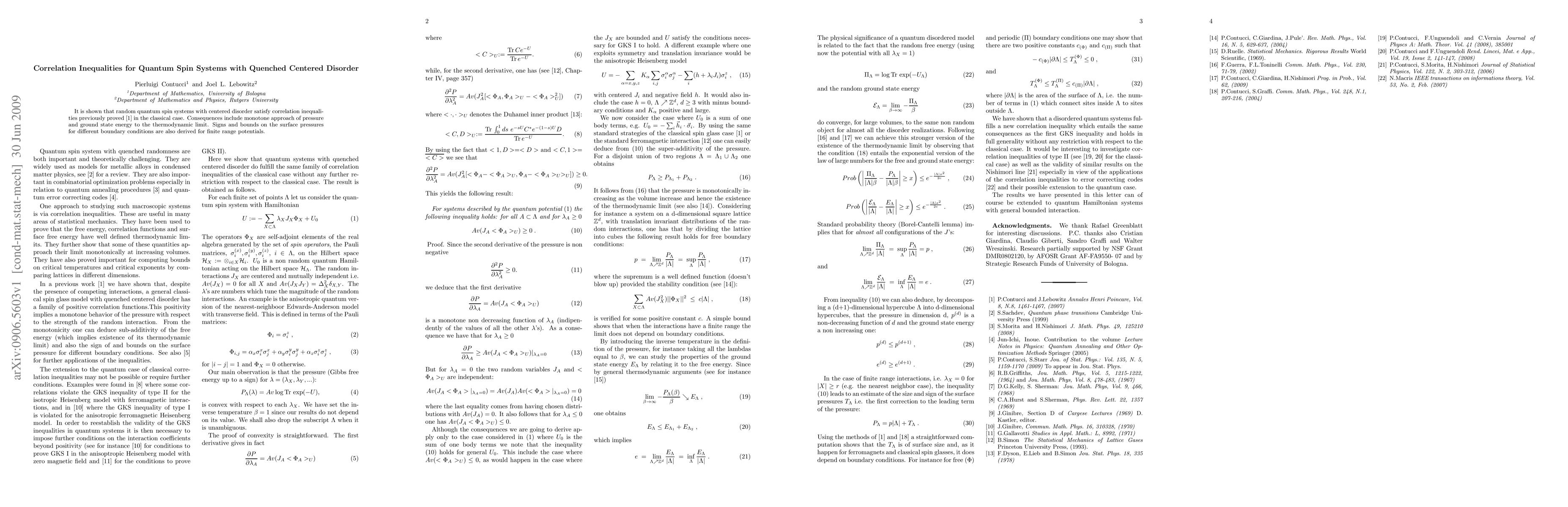 Researchers have shown that quantum spin systems with quenched centered disorder satisfy previously proven correlation inequalities, leading to insights into thermodynamic behavior.