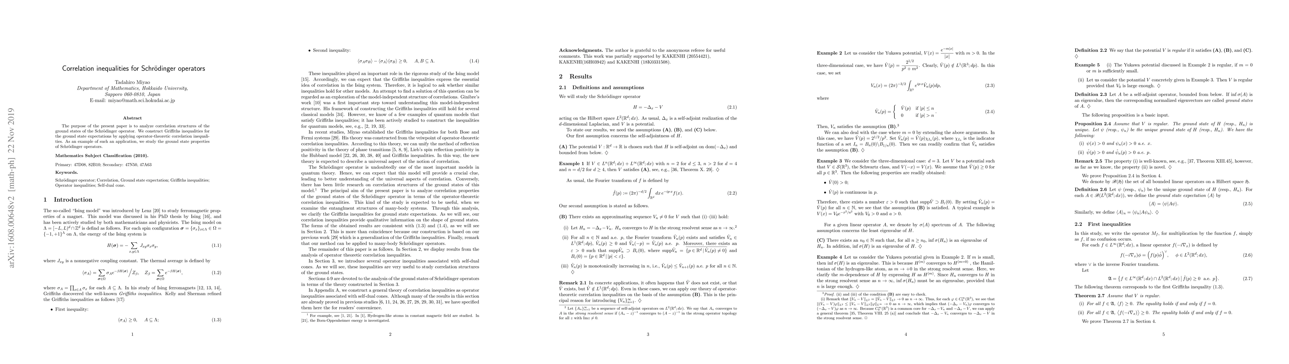This paper analyzes Sch\"odinger operators from viewpoint of correlation inequalities. We construct Griffiths inequalities for the ground state expectations by applying operator-theoretic correlation inequalities. As an example of such an application, we analyze the momentum distribution, i.e., the Fourier transform of the ground state density.