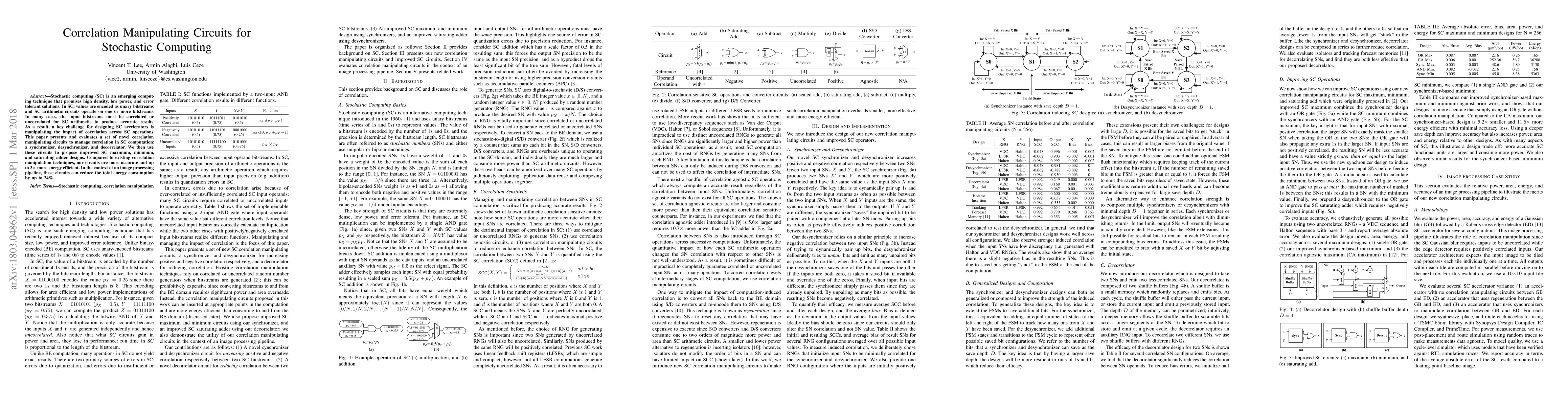 This paper introduces novel correlation manipulating circuits—synchronizer, desynchronizer, and decorrelator—to manage correlation in stochastic computing (SC) operations, leading to more accurate and energy-efficient SC arithmetic circuits. The proposed circuits reduce total energy consumption in image processing pipelines by up to 24%.