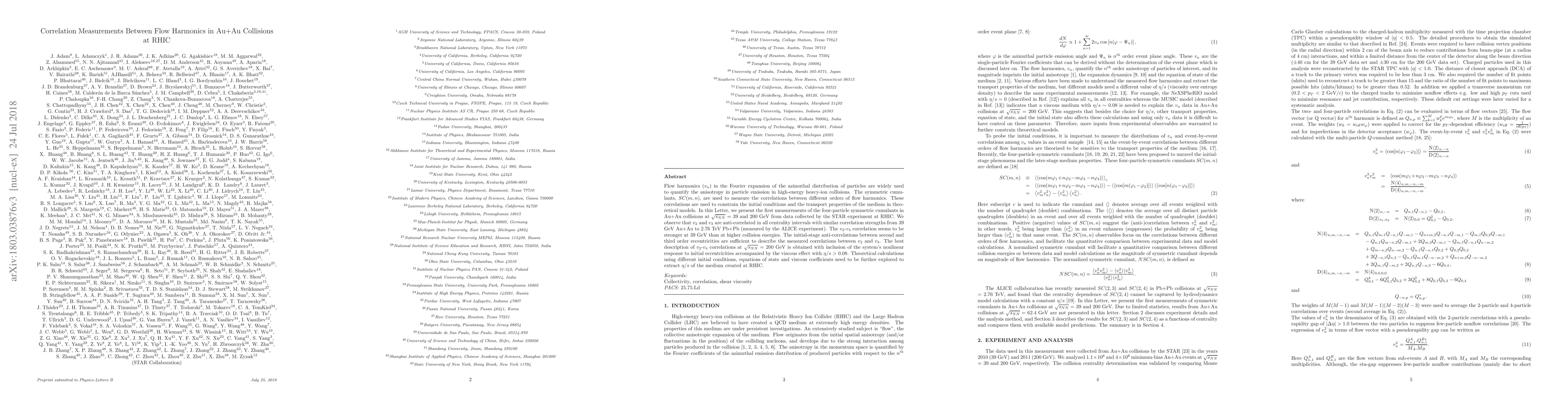 Flow harmonics ($v_n$) in the Fourier expansion of the azimuthal distribution of particles are widely used to quantify the anisotropy in particle emission in high-energy heavy-ion collisions. The symmetric cumulants, $SC(m,n)$, are used to measure the correlations between different orders of flow harmonics. These correlations are used to constrain the initial conditions and the transport properties of the medium in theoretical models. In this Letter, we present the first measurements of the four-particle symmetric cumulants in Au+Au collisions at $\sqrt{s_{NN}}$ = 39 and 200 GeV from data collected by the STAR experiment at RHIC. We observe that $v_{2}$ and $v_{3}$ are anti-correlated in all centrality intervals with similar correlation strengths from 39 GeV Au+Au to 2.76 TeV Pb+Pb (measured by the ALICE experiment). The $v_{2}$-$v_{4}$ correlation seems to be stronger at 39 GeV than at higher collision energies. The initial-stage anti-correlations between second and third order eccentricities are sufficient to describe the measured correlations between $v_{2}$ and $v_{3}$. The best description of $v_{2}$-$v_{4}$ correlations at $\sqrt{s_{NN}}$ = 200 GeV is obtained with inclusion of the system's nonlinear response to initial eccentricities accompanied by the viscous effect with $\eta/s$ $>$ 0.08. Theoretical calculations using different initial conditions, equations of state and viscous coefficients need to be further explored to extract $\eta/s$ of the medium created at RHIC.