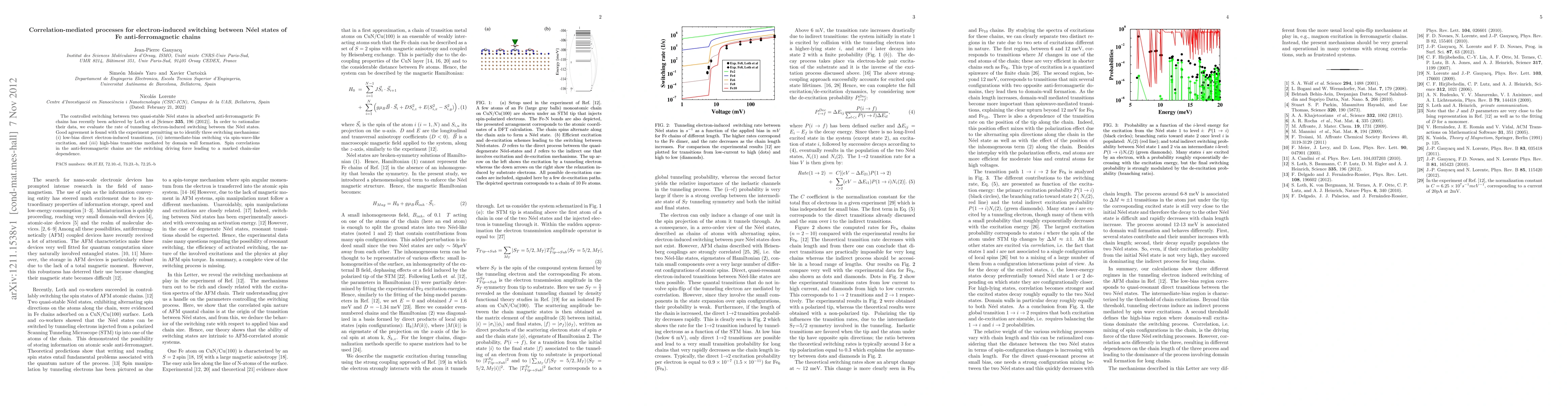 The controlled switching between two quasi-stable Neel states in adsorbed anti-ferromagnetic Fe chains has recently been achieved by Loth et al [Science 335, 196 (2012)]. In order to rationalize their data, we evaluate the rate of tunneling electron-induced switching between the N\'eel states. Good agreement is found with the experiment permitting us to identify three switching mechanisms: (i) low-bias direct electron-induced transitions, (ii) intermediate-bias switching via spin-wave-like excitation, and (iii) high-bias transitions mediated by domain wall formation. Spin correlations in the anti-ferromagnetic chains are the switching driving force leading to a marked chain-size dependence.